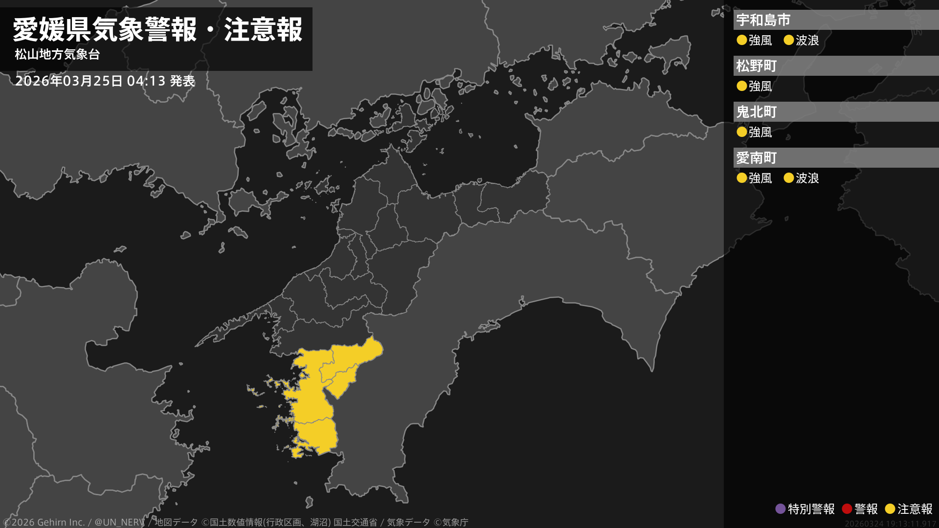 【愛媛県 気象警報・注意報 2026年03月25日 04:13】南予では、25日昼前から26日明け方まで強風や高波に注意してください。#気象警報注意報 #愛媛県