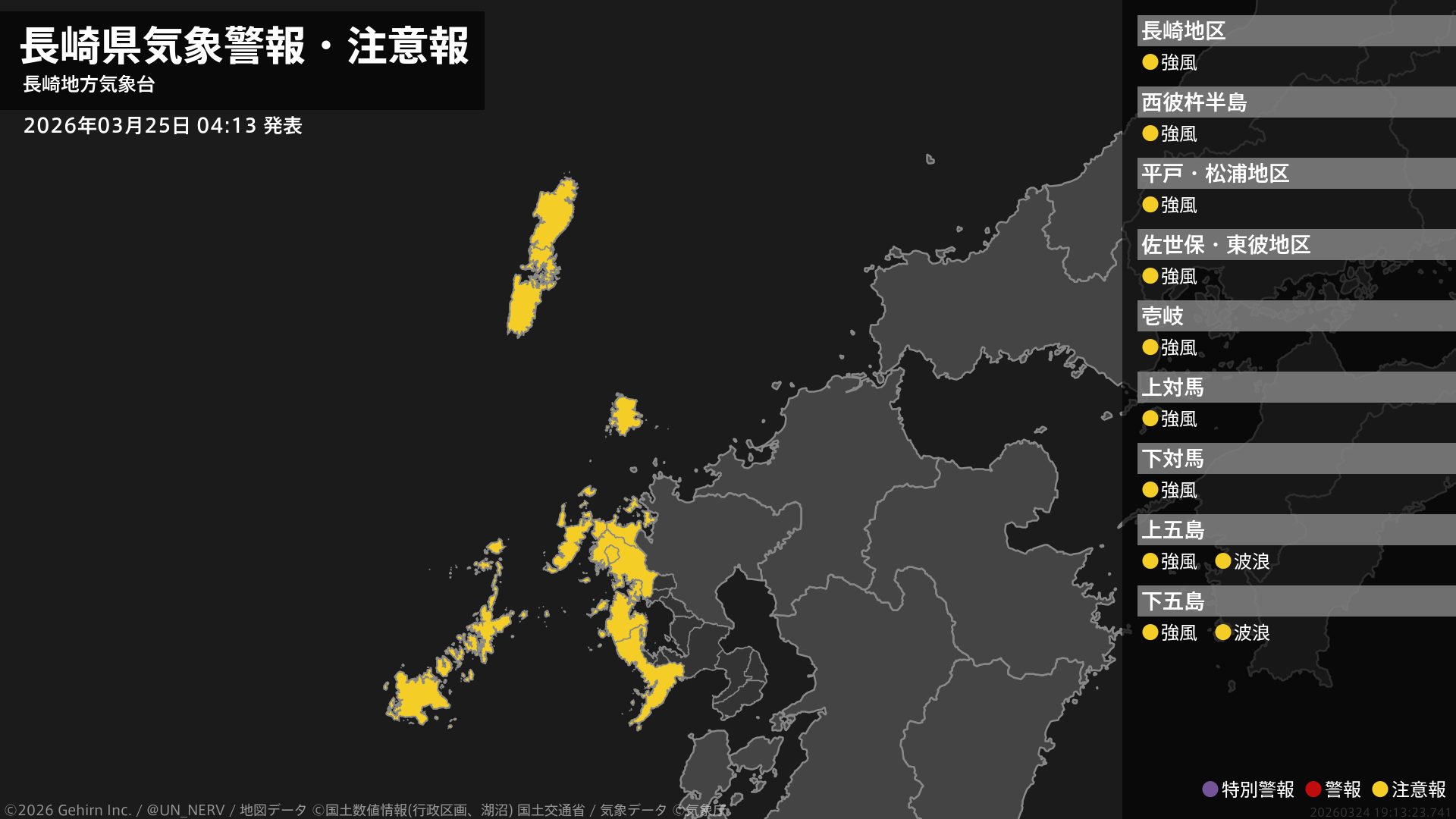 【長崎県 気象警報・注意報 2026年03月25日 04:13】長崎県では、強風に注意してください。五島では、高波に注意してください。#気象警報注意報 #長崎県