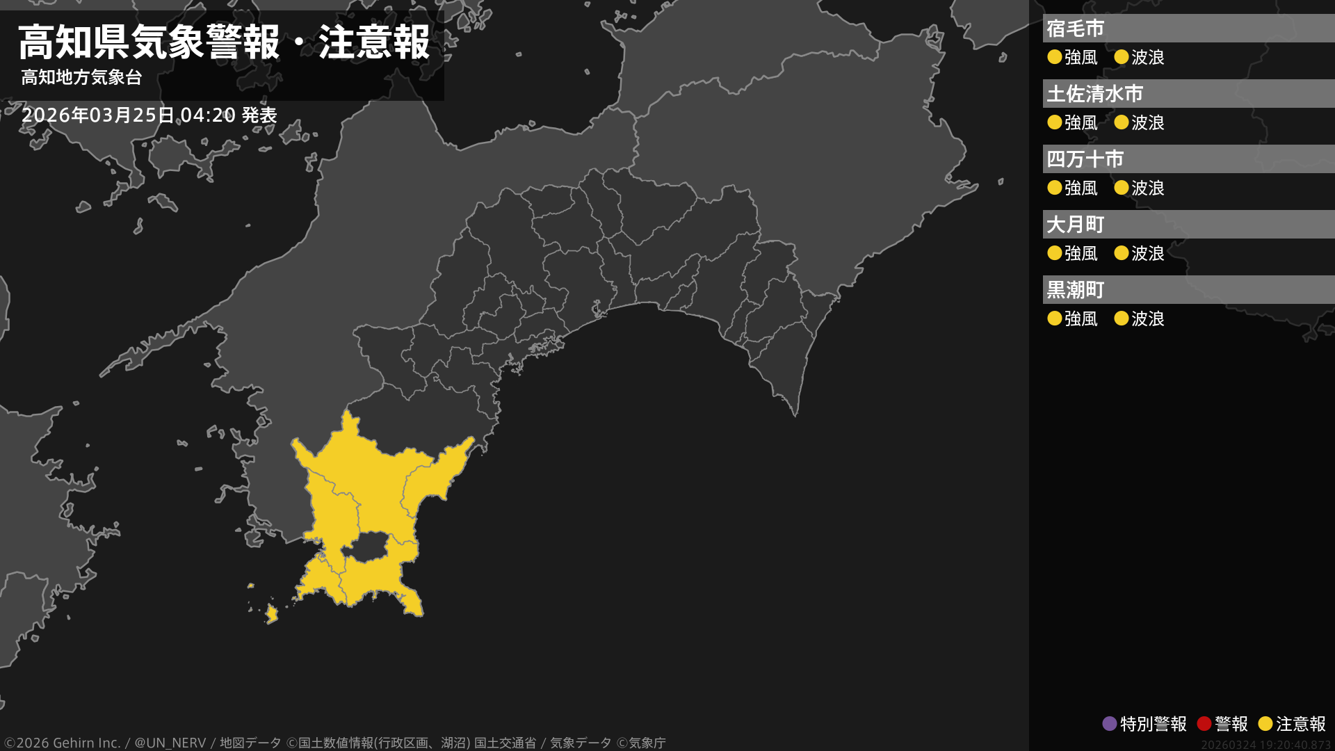 【高知県 気象警報・注意報 2026年03月25日 04:20】西部では、25日昼前から26日明け方まで強風に、25日昼前から高波に注意してください。#気象警報注意報 #高知県
