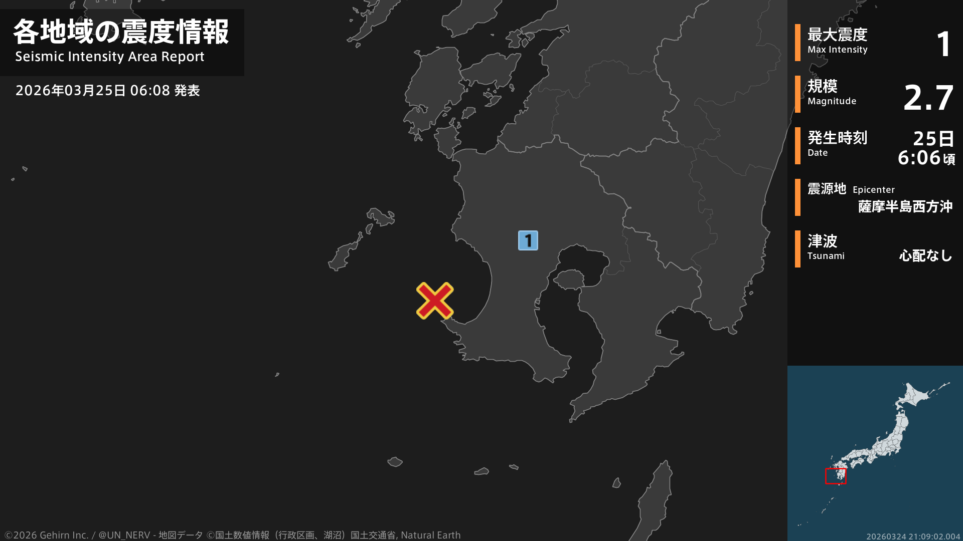 【地震情報 2026年3月25日】6時6分頃、薩摩半島西方沖を震源とする地震がありました。震源の深さはごく浅い、地震の規模はM2.7、最大震度1を鹿児島県で観測しています。この地震による津波の心配はありません。#地震 #鹿児島県