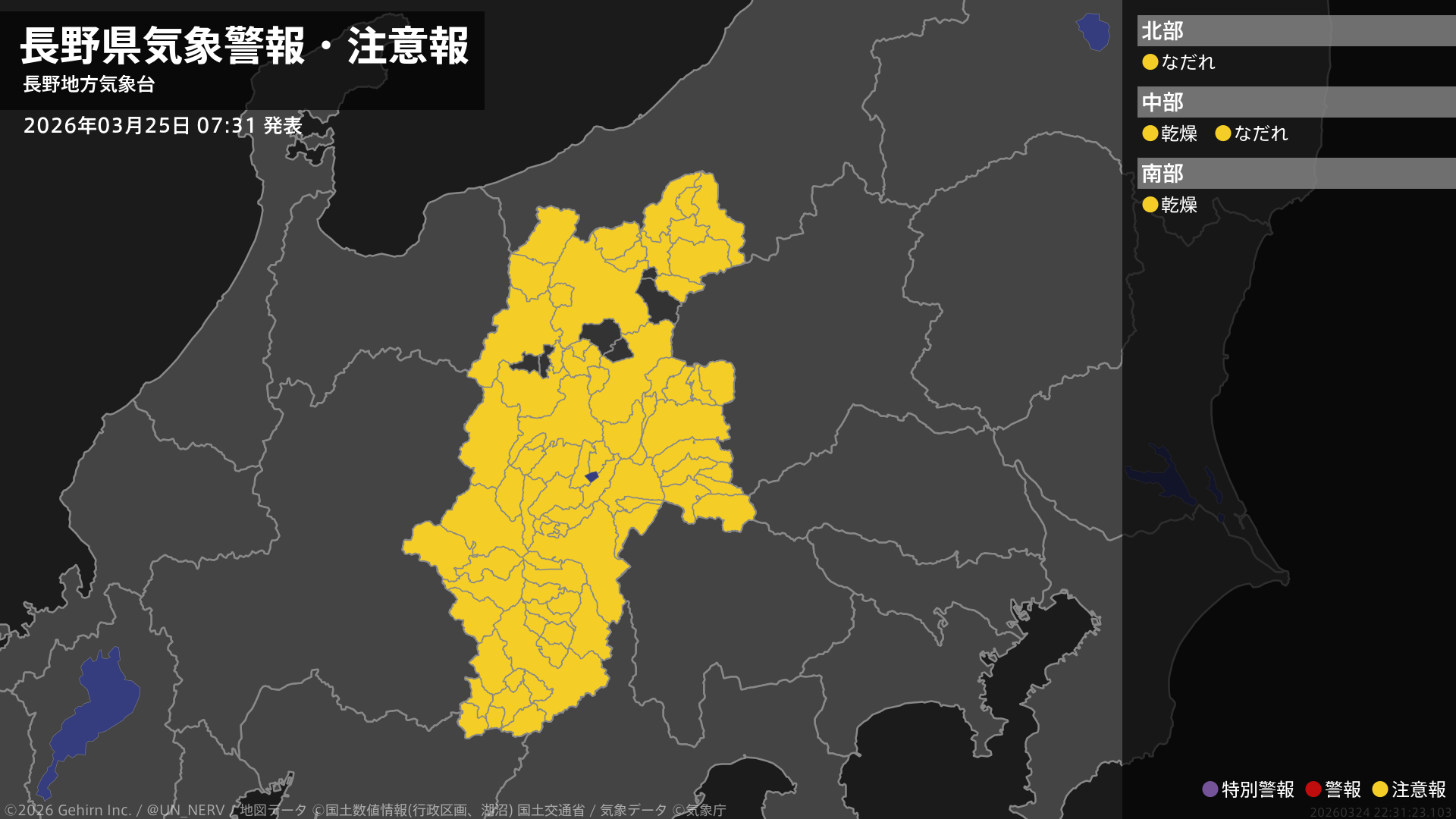【長野県 気象警報・注意報 2026年03月25日 07:31】中部、南部では、25日まで空気の乾燥した状態が続くため、火の取り扱いに注意してください。北部、中部では、26日までなだれに注意してください。#気象警報注意報 #長野県