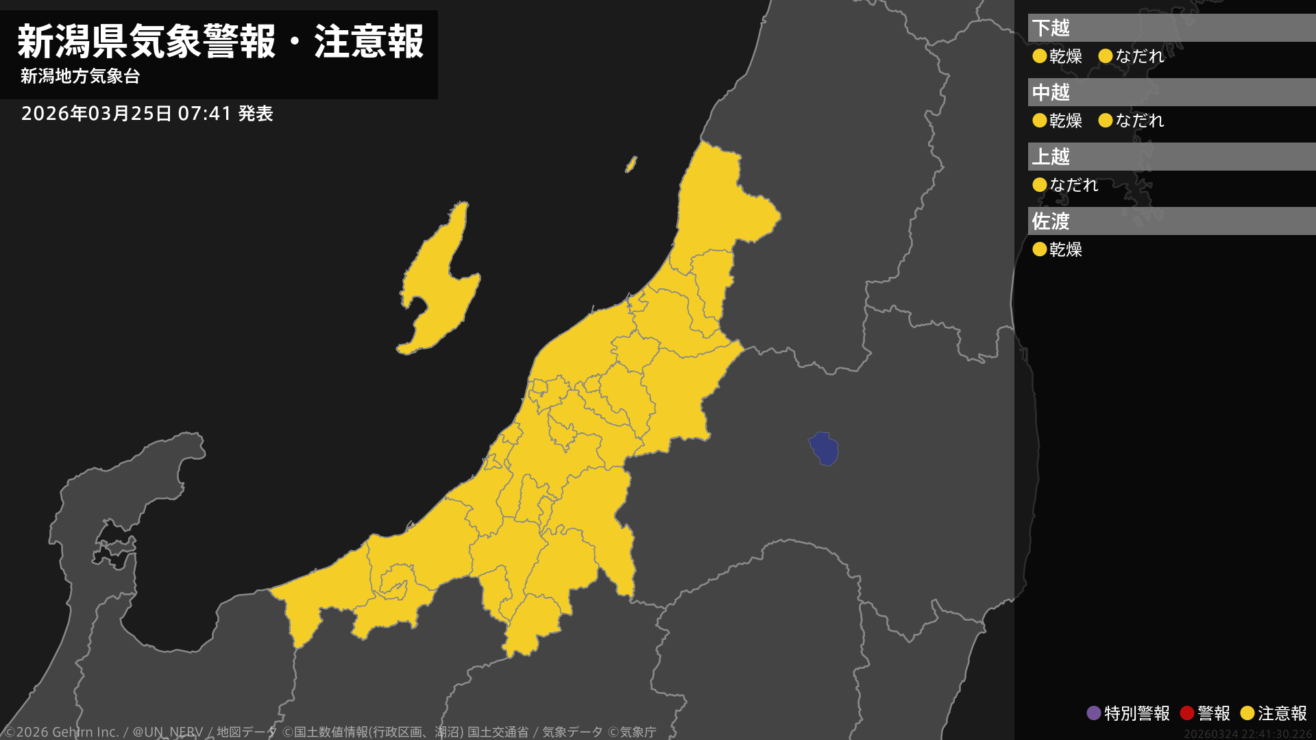【新潟県 気象警報・注意報 2026年03月25日 07:41】下越、中越、佐渡では、25日まで空気の乾燥した状態が続くため、火の取り扱いに注意してください。下越、中越、上越では、ここしばらくなだれに注意してください。#気象警報注意報 #新潟県