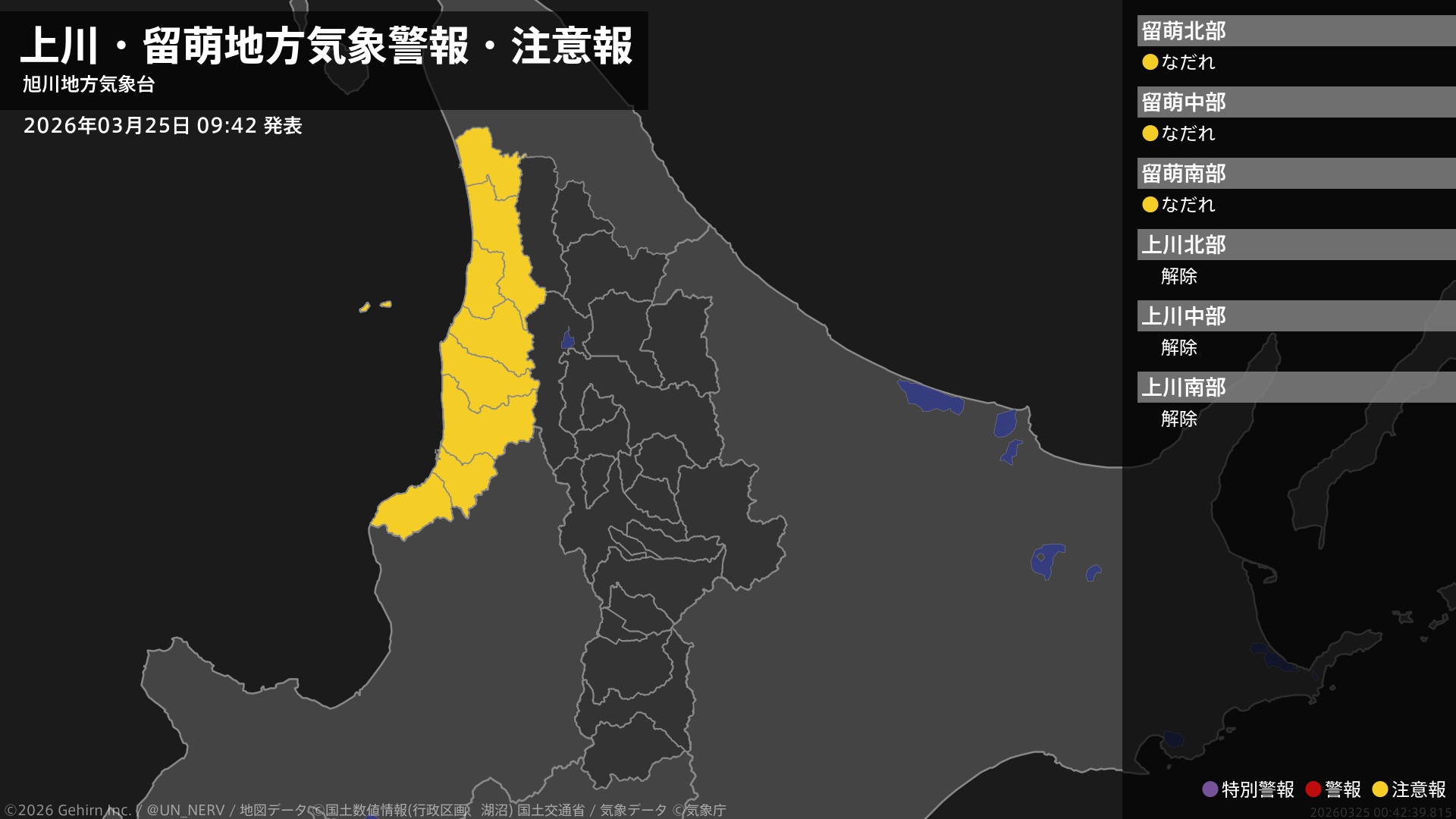 【上川・留萌地方 気象警報・注意報 2026年03月25日 09:42】留萌地方では、26日までなだれに注意してください。#気象警報注意報 #上川地方 #留萌地方