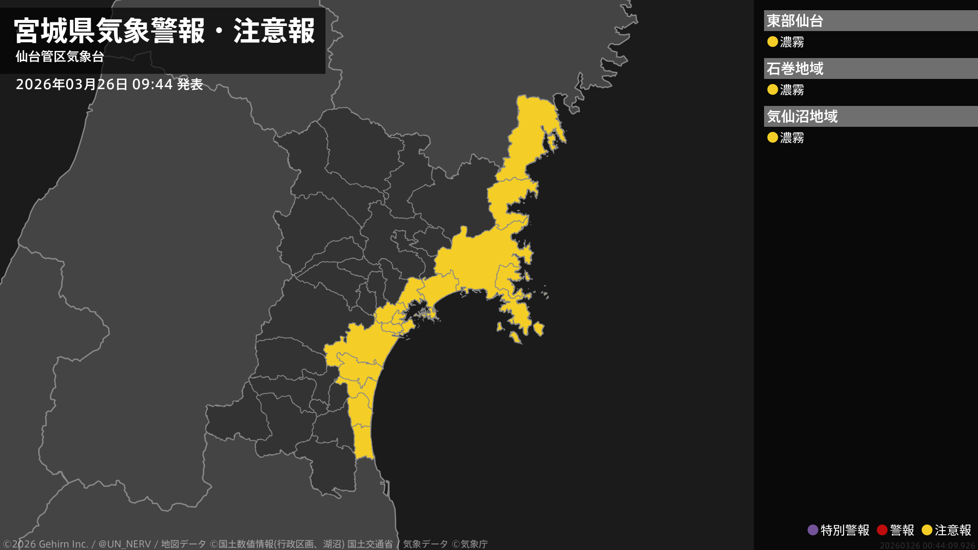 【宮城県 気象警報・注意報 2026年03月26日 09:44】東部では、27日昼前まで濃霧による視程障害に注意してください。#気象警報注意報 #宮城県