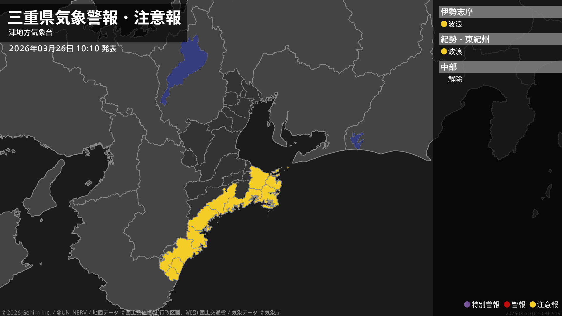 【三重県 気象警報・注意報 2026年03月26日 10:10】南部では、26日夜遅くまで高波に注意してください。#気象警報注意報 #三重県