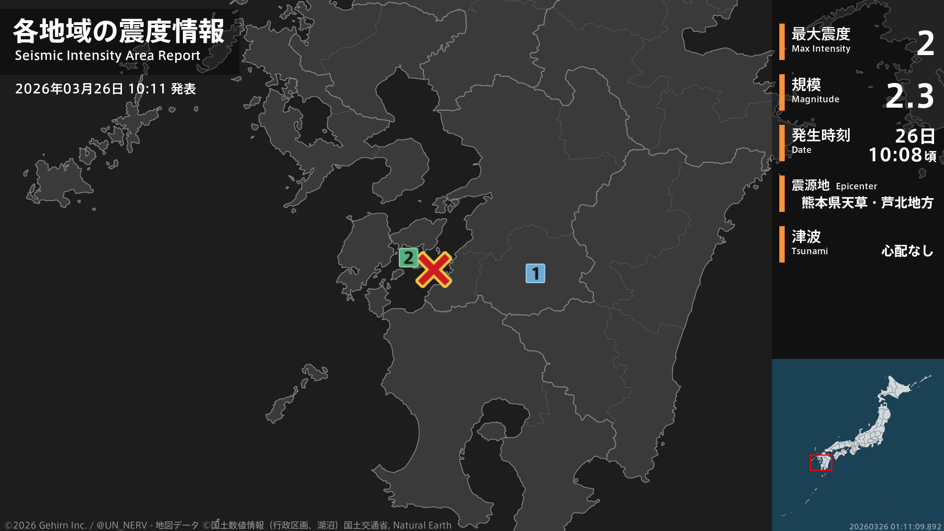 【地震情報 2026年3月26日】10時8分頃、熊本県天草・芦北地方を震源とする地震がありました。震源の深さは約10km、地震の規模はM2.3、最大震度2を熊本県で観測しています。この地震による津波の心配はありません。#地震 #熊本県