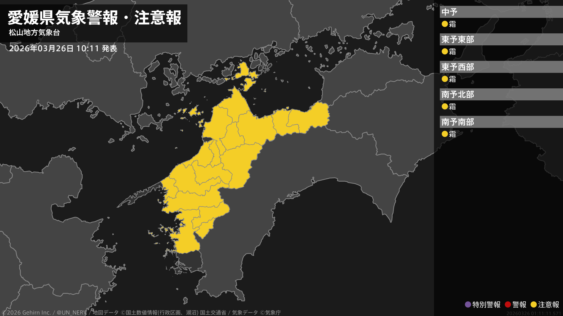 【愛媛県 気象警報・注意報 2026年03月26日 10:11】愛媛県では、27日朝は霜に対する農作物の管理に注意してください。#気象警報注意報 #愛媛県