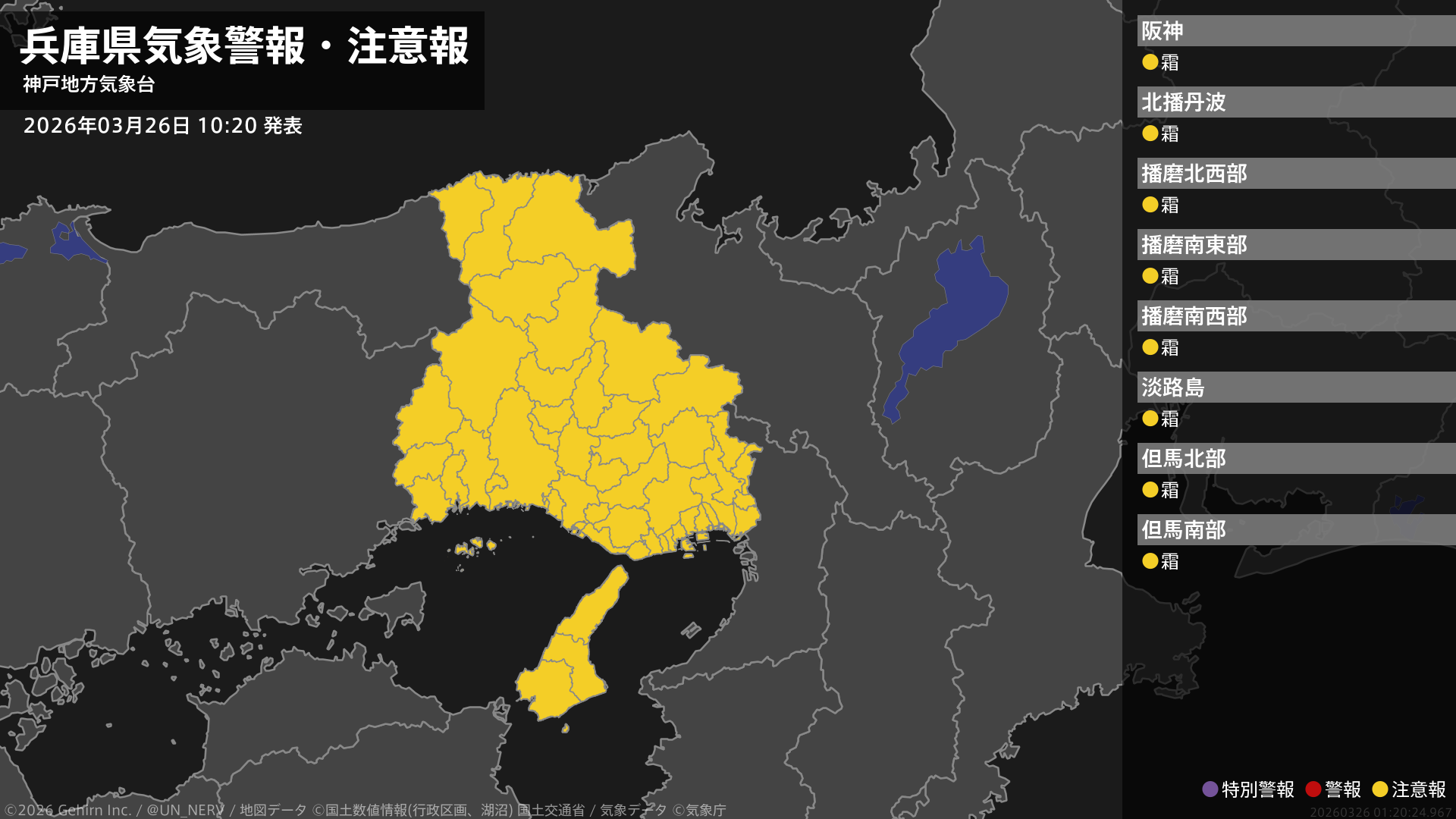 【兵庫県 気象警報・注意報 2026年03月26日 10:20】兵庫県では、27日朝は霜に対する農作物の管理に注意してください。#気象警報注意報 #兵庫県