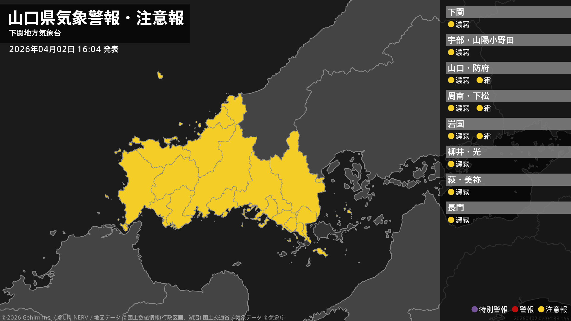 【山口県 気象警報・注意報 2026年04月02日 16:04】山口県では、3日未明から3日昼前まで濃霧による視程障害に注意してください。中部、東部では、3日朝は霜に対する農作物の管理に注意してください。#気象警報注意報 #山口県