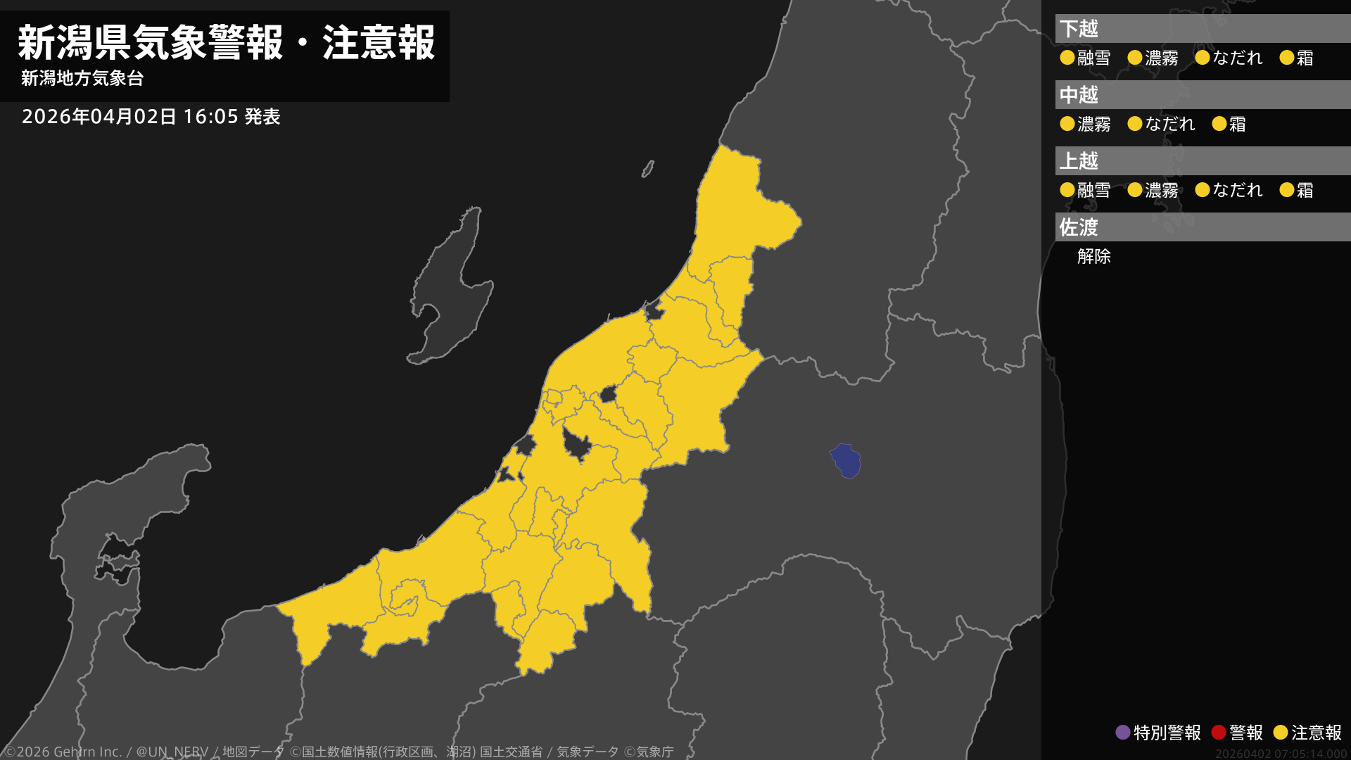 【新潟県 気象警報・注意報 2026年04月02日 16:05】下越、上越では、融雪による土砂災害に注意してください。下越、中越、上越では、濃霧による視程障害やなだれ、霜に対する農作物の管理に注意してください。#気象警報注意報 #新潟県