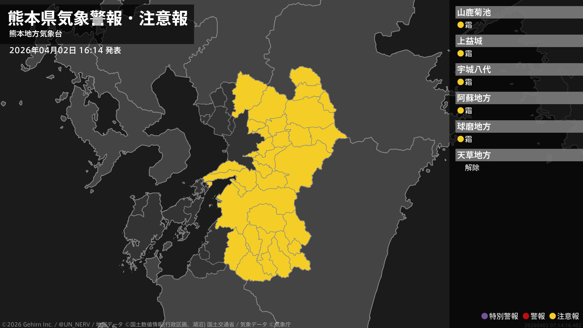 【熊本県 気象警報・注意報 2026年04月02日 16:14】熊本、阿蘇、球磨地方では、3日朝は霜に対する農作物の管理に注意してください。#気象警報注意報 #熊本県