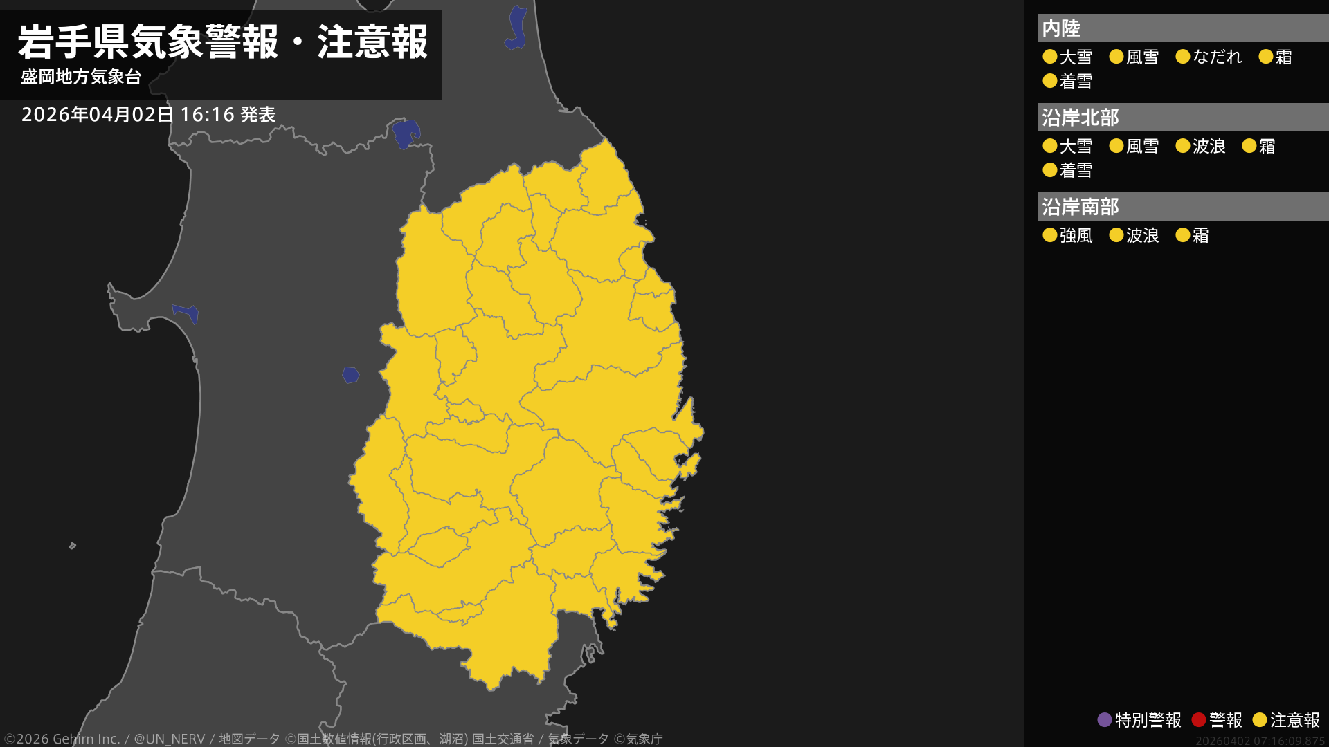 【岩手県 気象警報・注意報 2026年04月02日 16:16】沿岸南部では強風に、内陸、沿岸北部では風雪や大雪、電線等への着雪に、沿岸北部、沿岸南部では高波に、内陸ではなだれに、岩手県では霜に対する農作物の管理に注意してください。#気象警報注意報 #岩手県