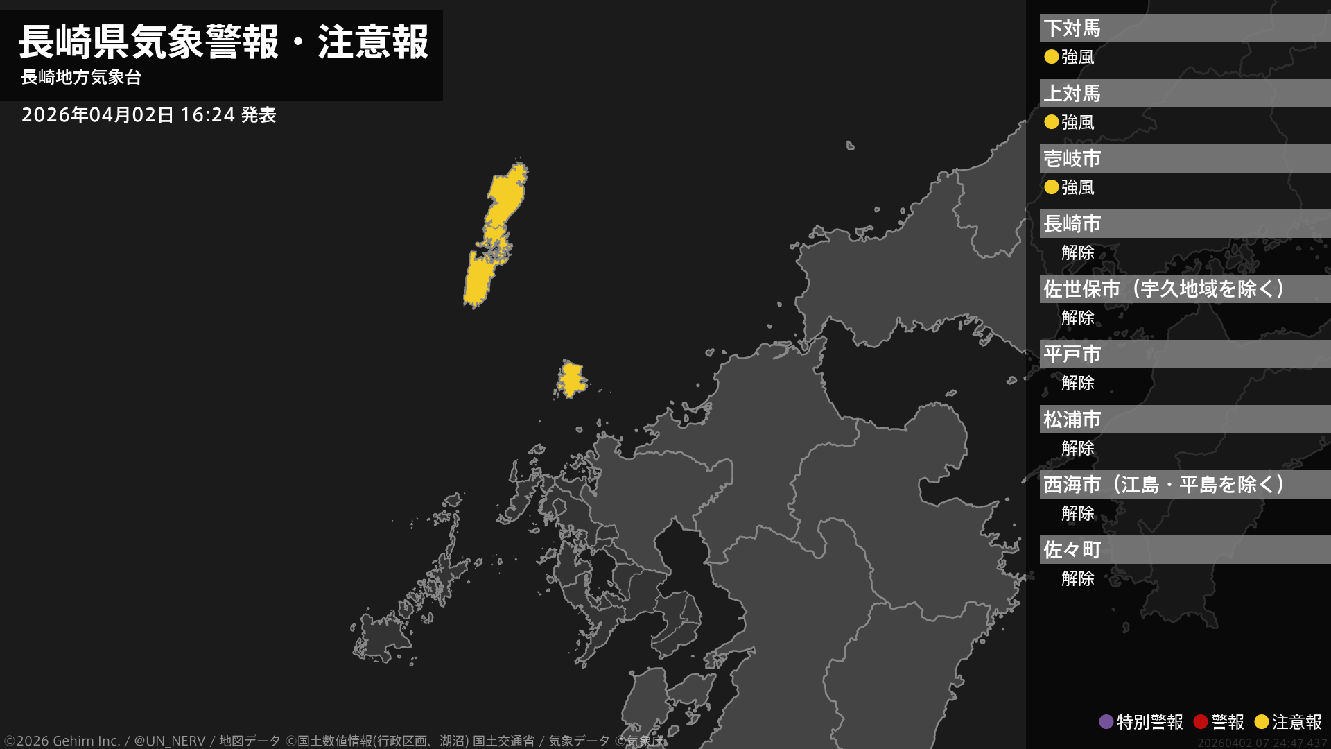 【長崎県 気象警報・注意報 2026年04月02日 16:24】壱岐・対馬では、2日夜遅くまで強風に注意してください。#気象警報注意報 #長崎県
