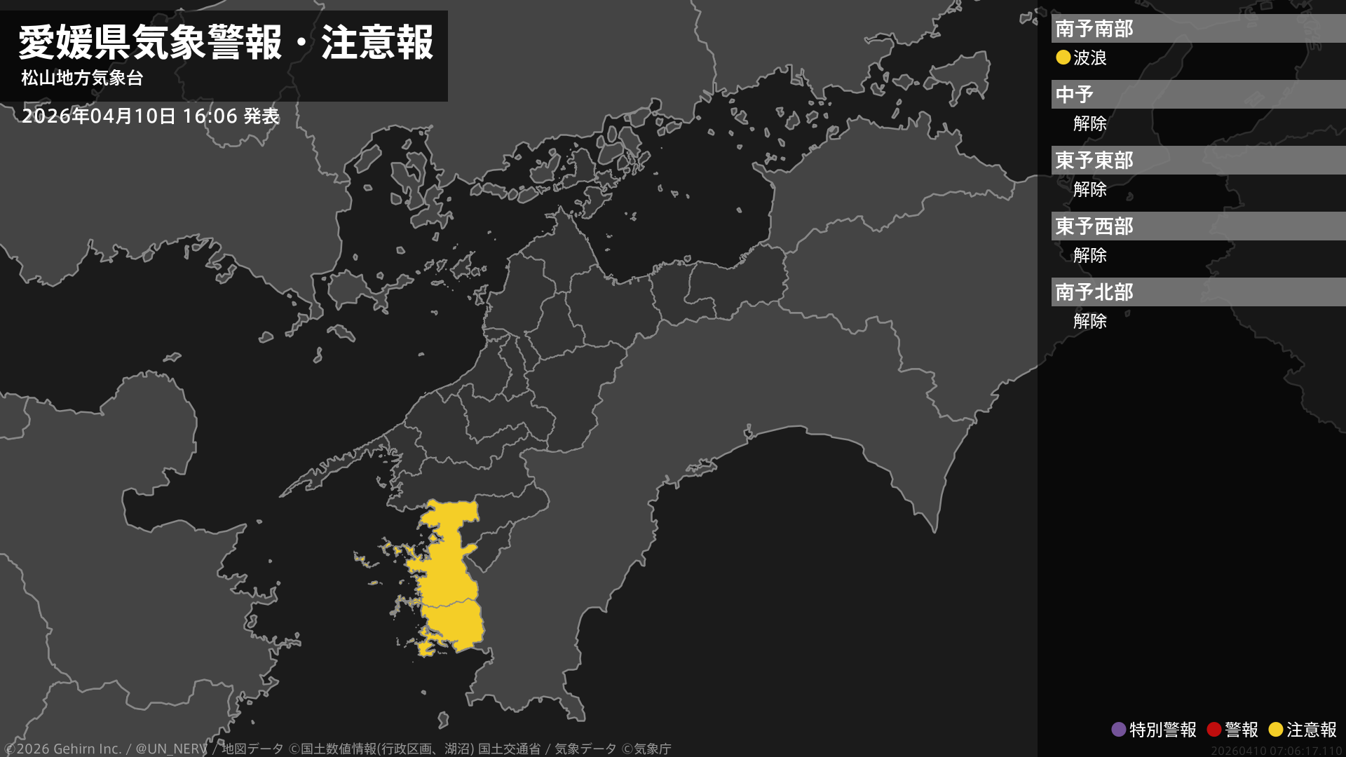 【愛媛県 気象警報・注意報 2026年04月10日 16:06】南予では、10日夜遅くまで高波に注意してください。#気象警報注意報 #愛媛県