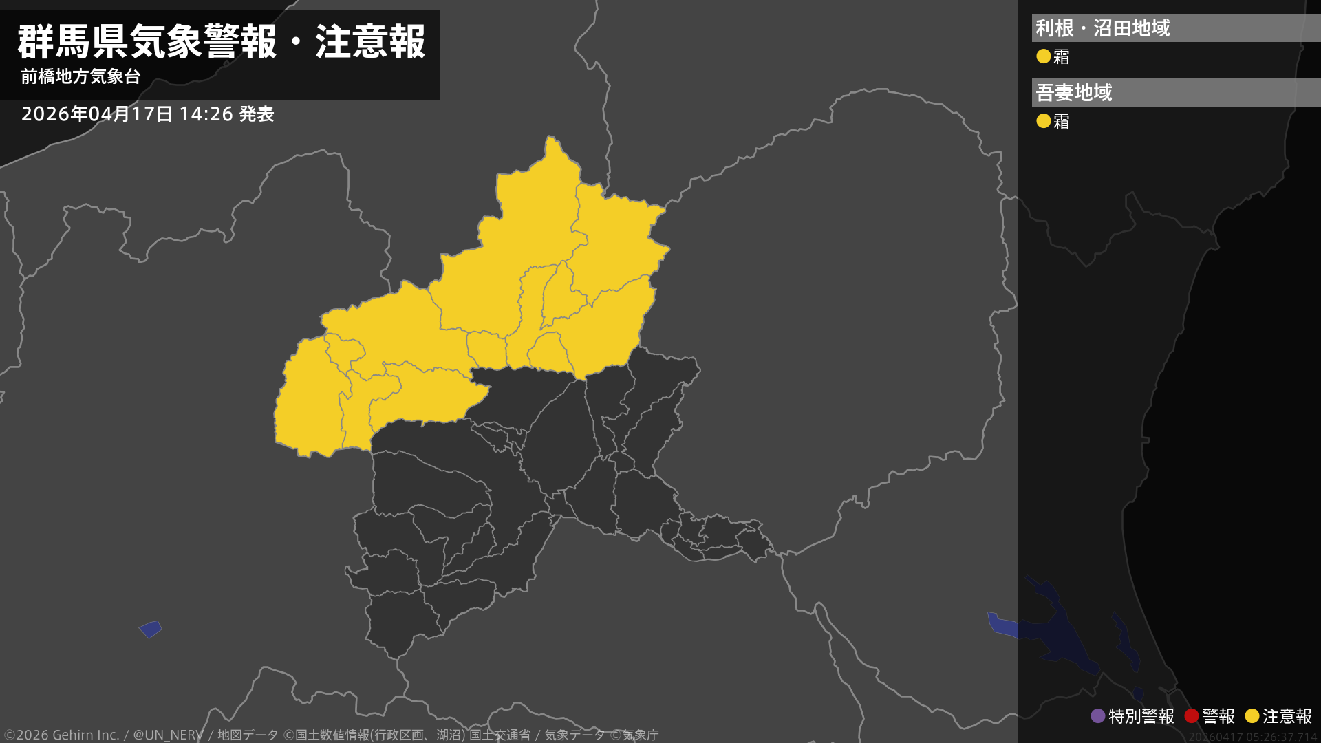 【群馬県 気象警報・注意報 2026年04月17日 14:26】北部では、18日朝は霜に対する農作物の管理に注意してください。#気象警報注意報 #群馬県