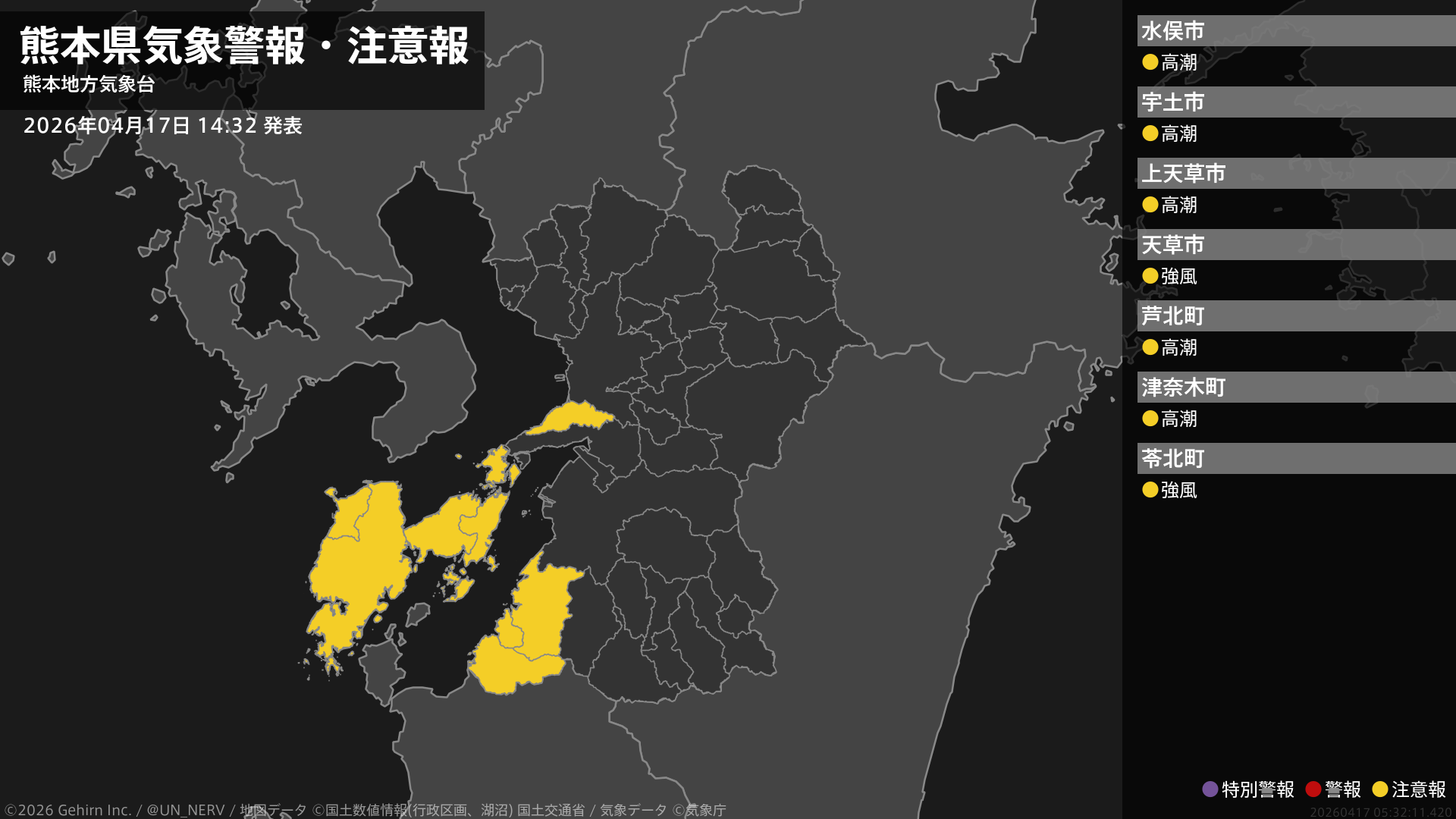 【熊本県 気象警報・注意報 2026年04月17日 14:32】天草・芦北地方では、17日夕方から18日明け方まで強風に注意してください。熊本地方では17日まで、天草・芦北地方では19日まで、高潮に注意してください。#気象警報注意報 #熊本県