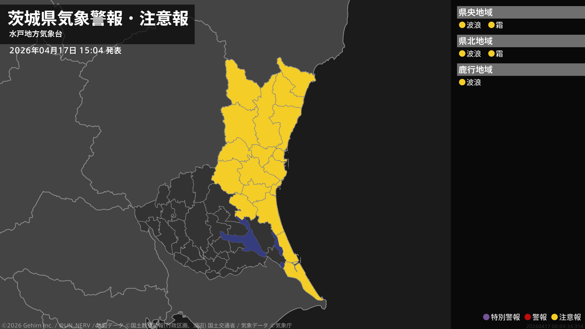 【茨城県 気象警報・注意報 2026年04月17日 15:04】茨城県では、高波に注意してください。北部では、霜に対する農作物の管理に注意してください。#気象警報注意報 #茨城県