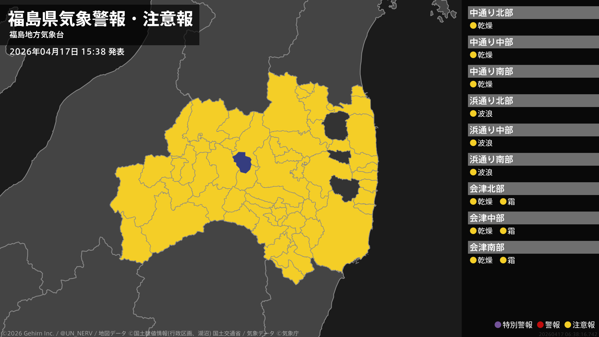 【福島県 気象警報・注意報 2026年04月17日 15:38】浜通りでは、高波に注意してください。中通り、会津では、空気の乾燥した状態が続くため、火の取り扱いに注意してください。会津では、霜に対する農作物の管理に注意してください。#気象警報注意報 #福島県