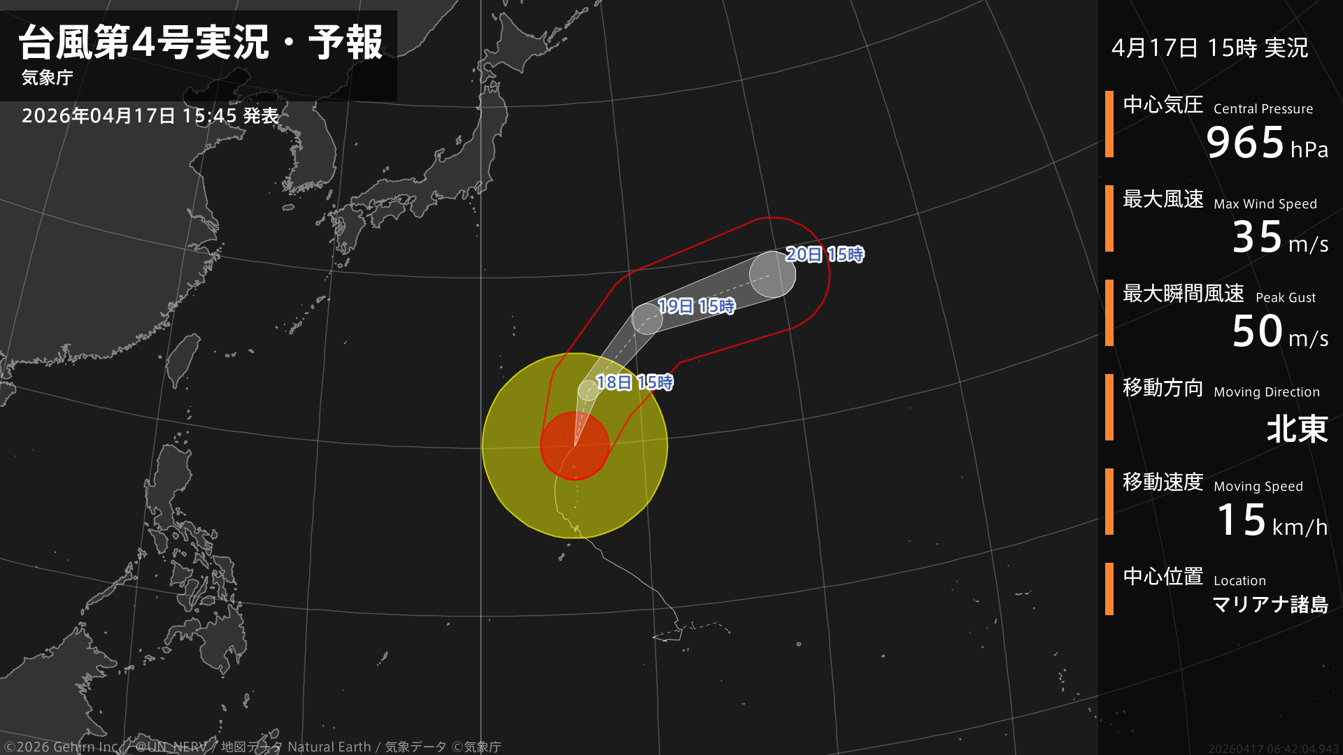 【台風第4号実況・予報 2026年04月17日 15:42】大型で強い台風第4号(シンラコウ)は、マリアナ諸島を1時間に15キロの速さで北東に進んでいます。#台風情報