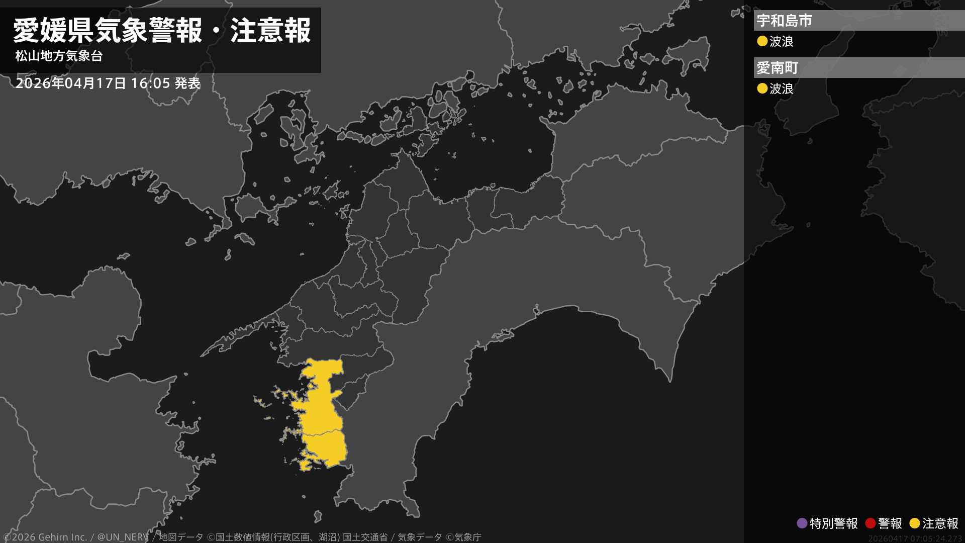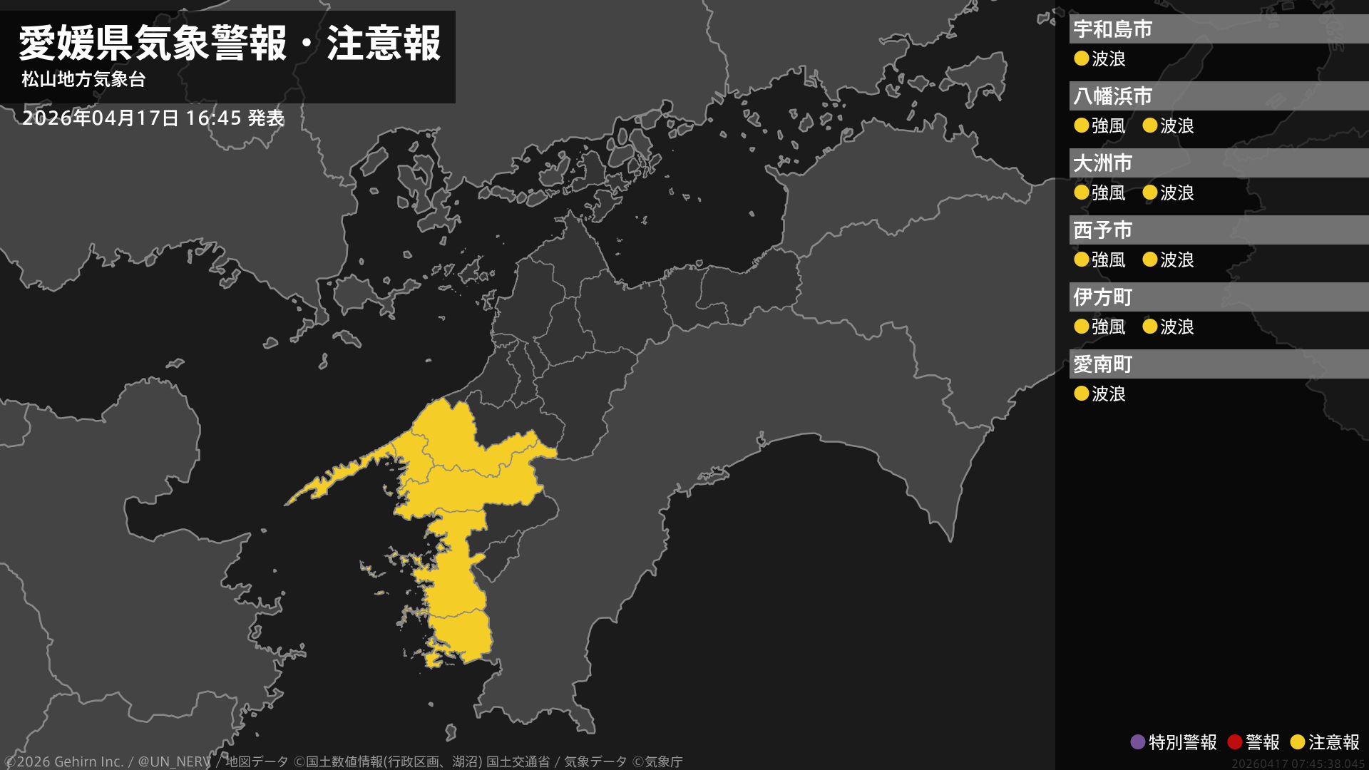 【愛媛県 気象警報・注意報 2026年04月17日 16:45】南予では、17日夜遅くまで強風に、18日夕方まで高波に注意してください。#気象警報注意報 #愛媛県