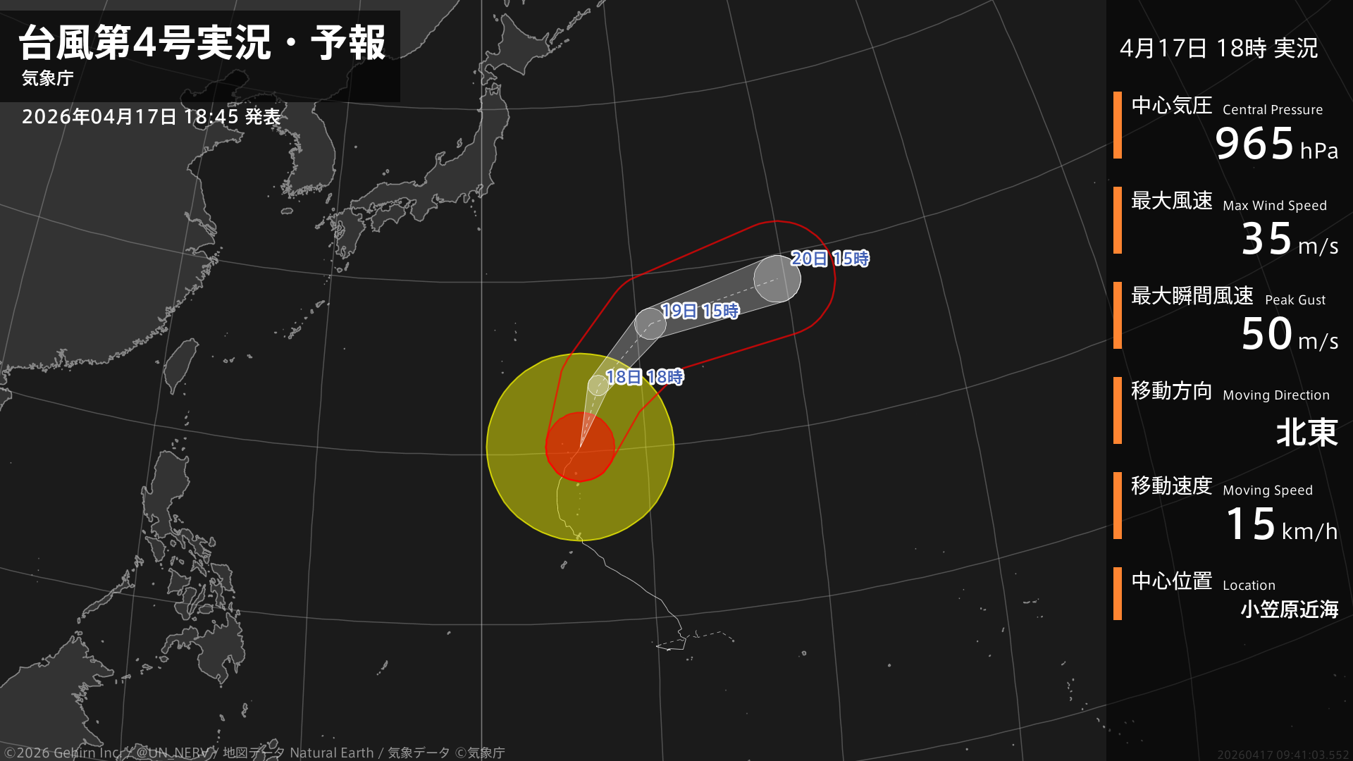 【台風第4号実況・予報 2026年04月17日 18:41】大型で強い台風第4号(シンラコウ)は、小笠原近海を1時間に15キロの速さで北東に進んでいます。#台風情報