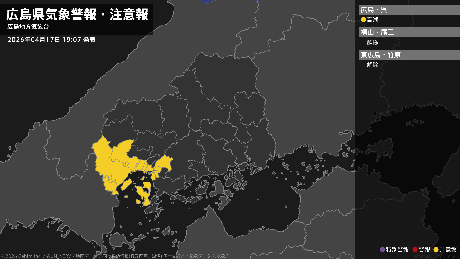 【広島県 気象警報・注意報 2026年04月17日 19:07】南部では、17日夜遅くは高潮に注意してください。#気象警報注意報 #広島県