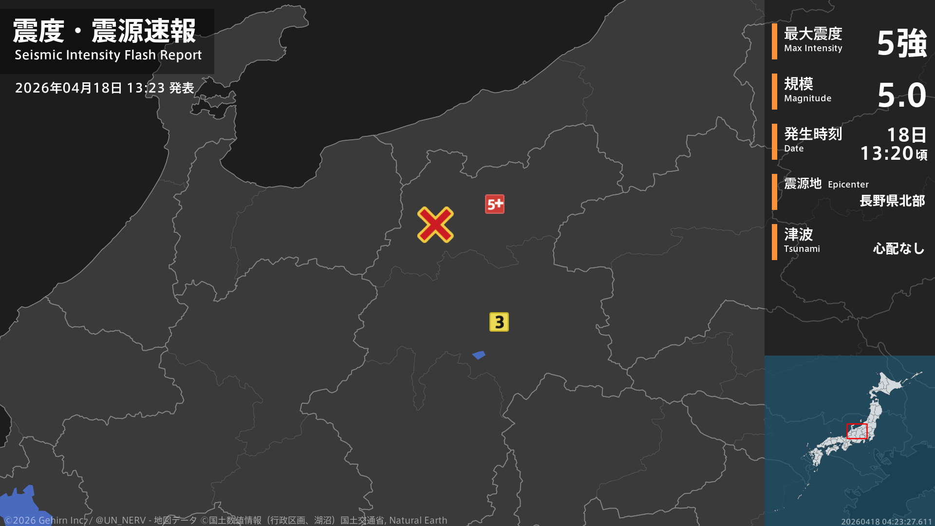 13時20分頃、長野県北部を震源とする地震がありました。震源の深さは約10km、地震の規模はM5.0と推定されています。この地震による津波の心配はありません。