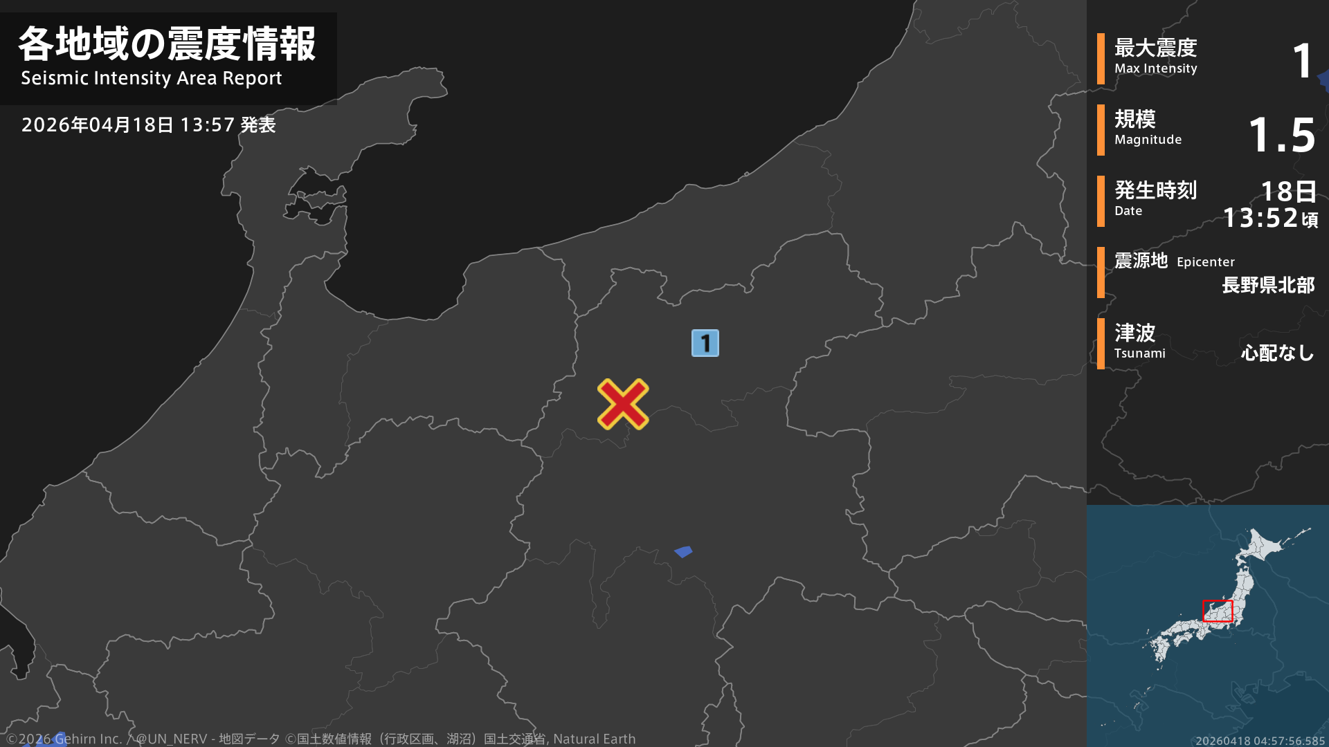 13時52分頃、長野県北部を震源とする地震がありました。震源の深さは約10km、地震の規模はM1.5、最大震度1を長野県で観測しています。この地震による津波の心配はありません。
