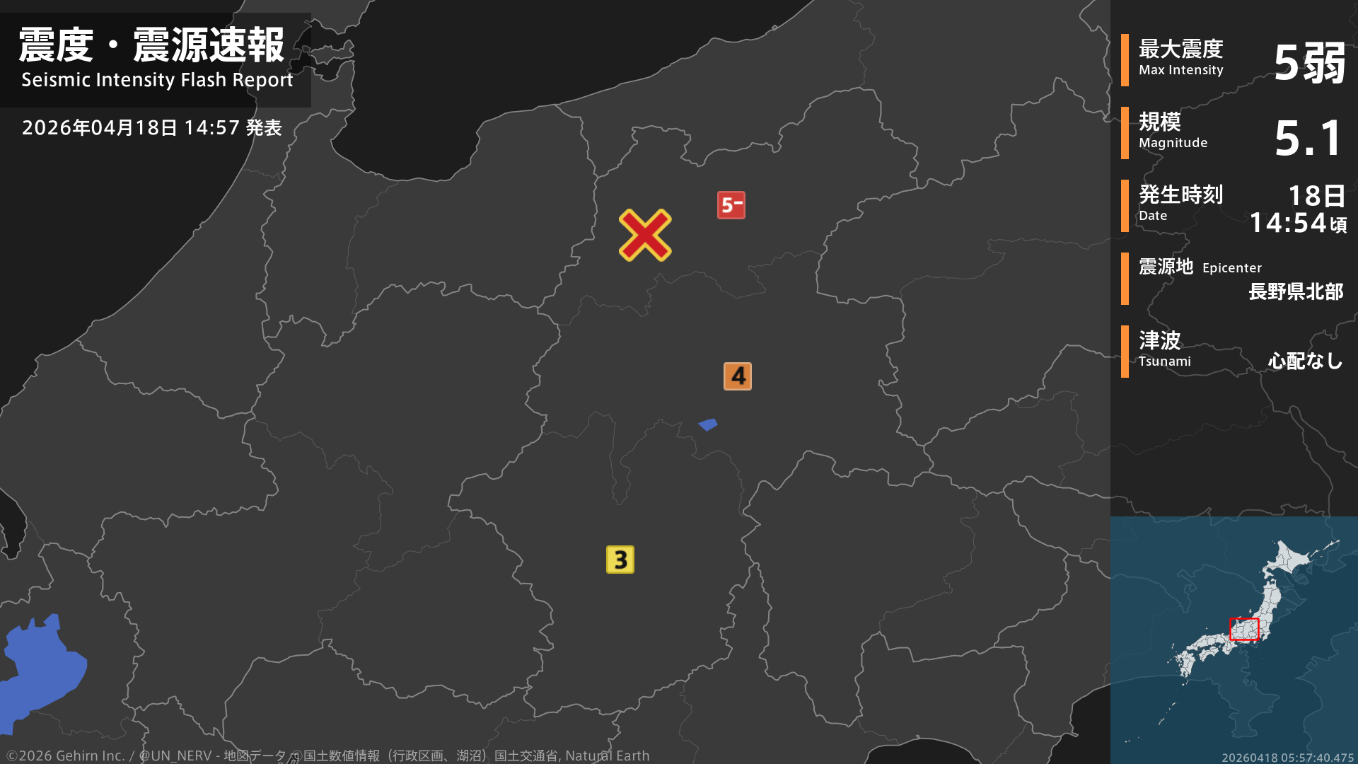14時54分頃、長野県北部を震源とする地震がありました。震源の深さは約10km、地震の規模はM5.1、最大震度5弱を長野県で観測しています。この地震による津波の心配はありません。