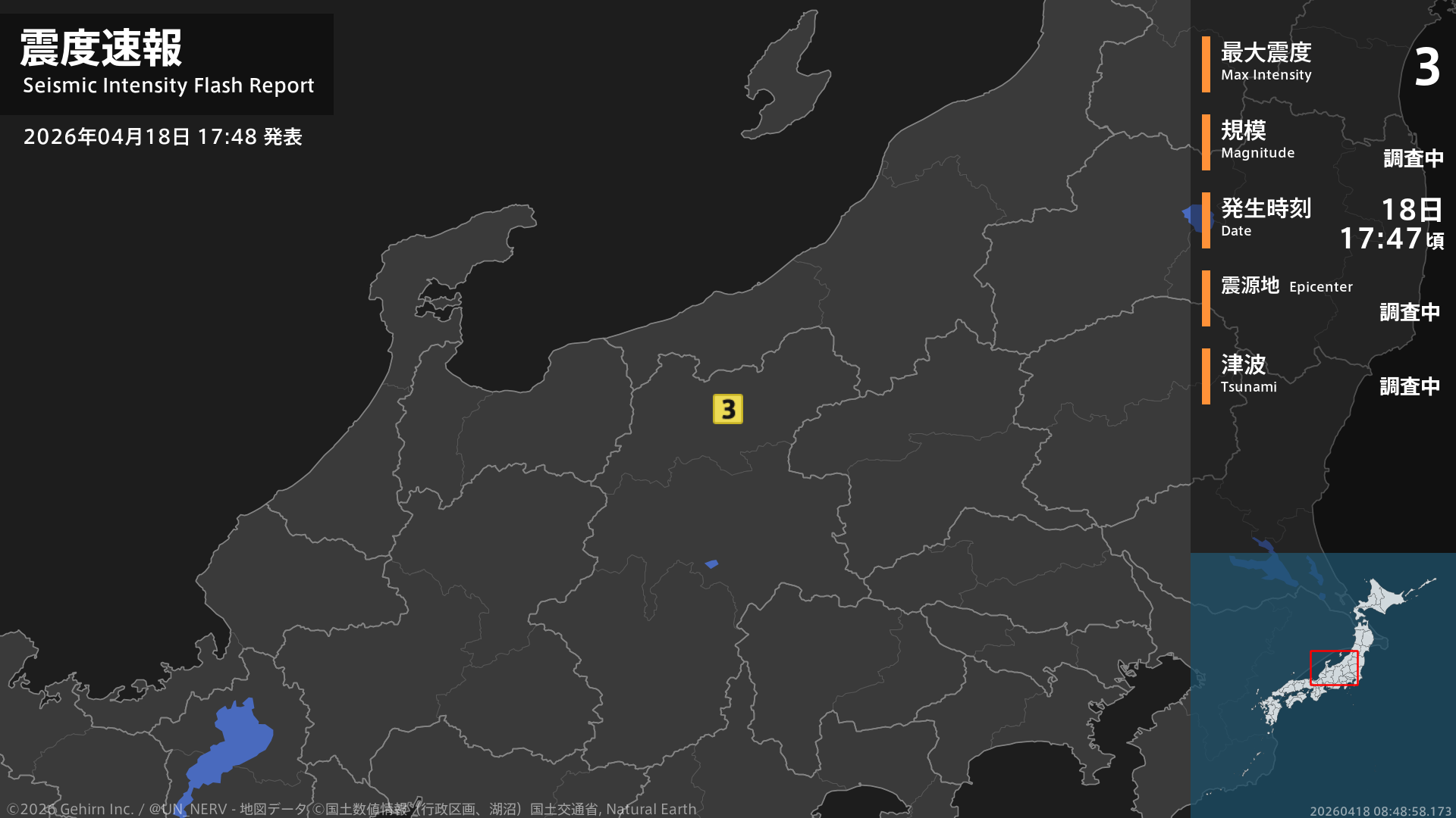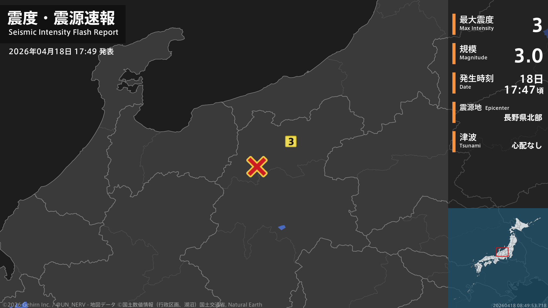 17時47分頃、長野県北部を震源とする地震がありました。震源の深さは約10km、地震の規模はM3.1程度、最大震度3程度と推定されています。詳しい情報が入り次第お伝えします。