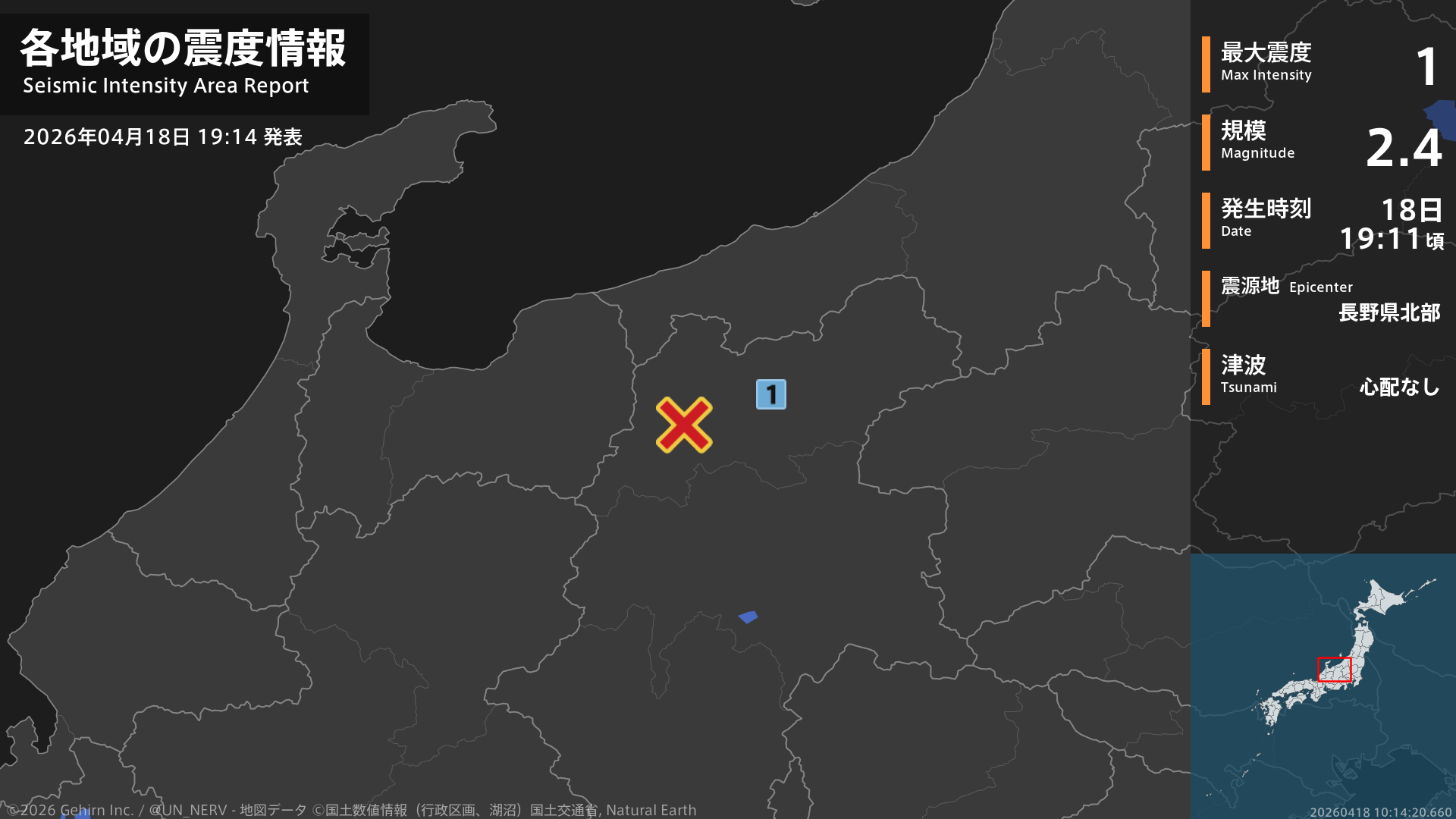 16時21分頃、長野県北部を震源とする地震がありました。震源の深さは約10km、地震の規模はM3.9程度、最大震度3程度と推定されています。詳しい情報が入り次第お伝えします。