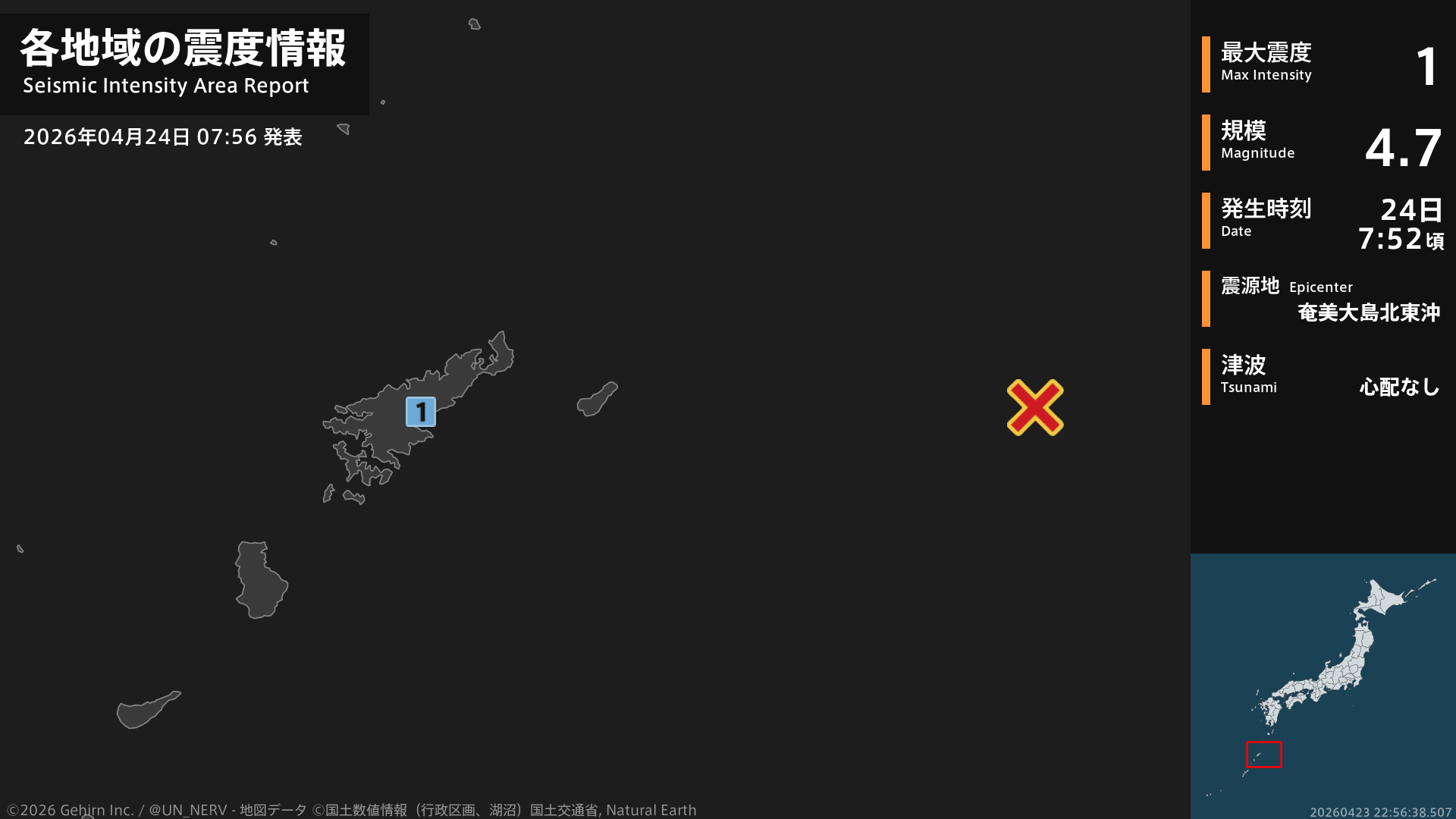 7時52分頃、奄美大島北東沖を震源とする地震がありました。震源の深さは約10km、地震の規模はM4.7、最大震度1を鹿児島県で観測しています。この地震による津波の心配はありません。