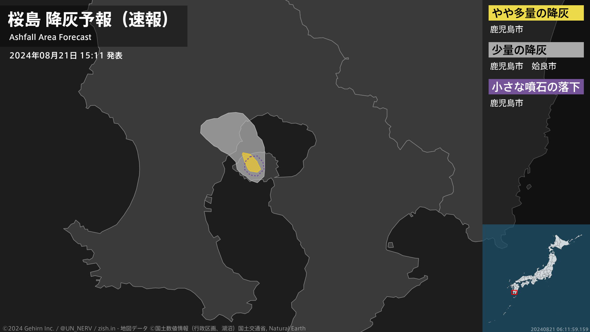 【桜島 降灰予報(速報)】1時間以内に鹿児島市(桜島)ではやや多量の降灰があり、降灰は鹿児島県鹿児島市まで予想されます。また、火口から北西方向およそ3kmまでの範囲では、小さな噴石が風に流されて降るおそれがあります。#降灰予報(速報)