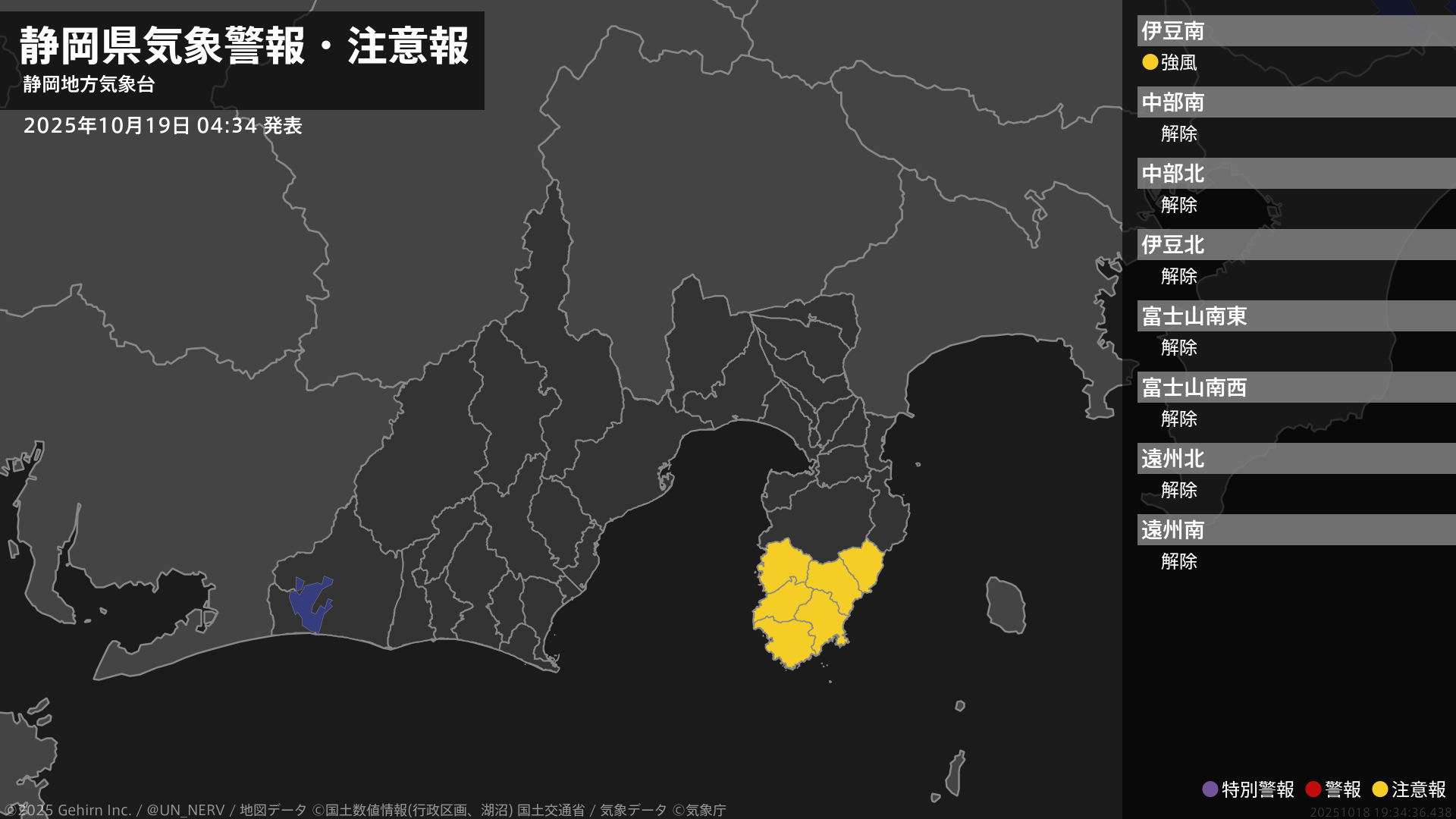 【静岡県 気象警報・注意報 2025年10月19日 04:34】伊豆では、19日昼前から19日夜のはじめ頃まで強風に注意してください。#気象警報注意報 #静岡県