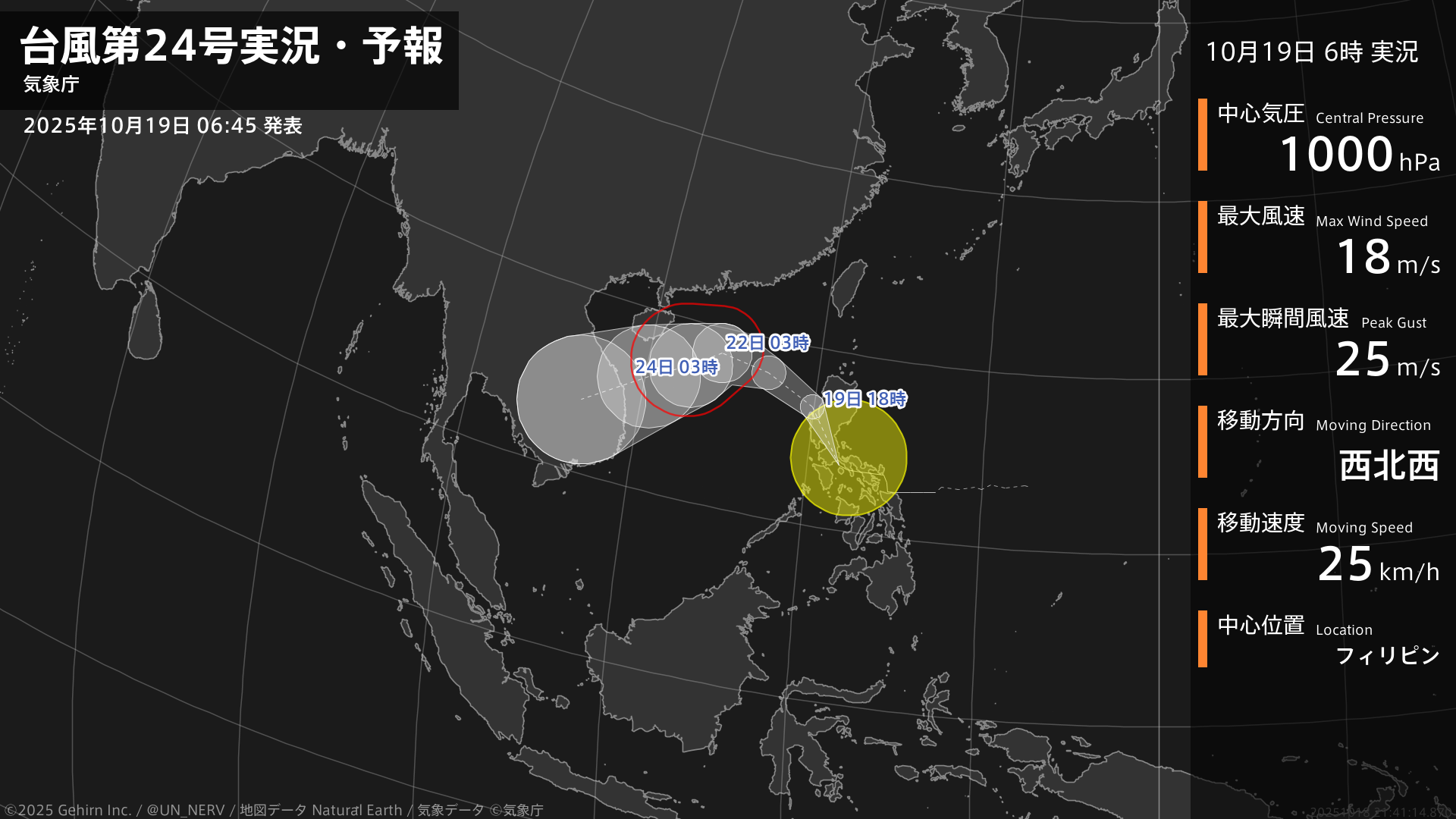 【台風第24号実況・予報 2025年10月19日 06:41】台風第24号(フンシェン)は、フィリピンを1時間に25キロの速さで西北西に進んでいます。#台風情報