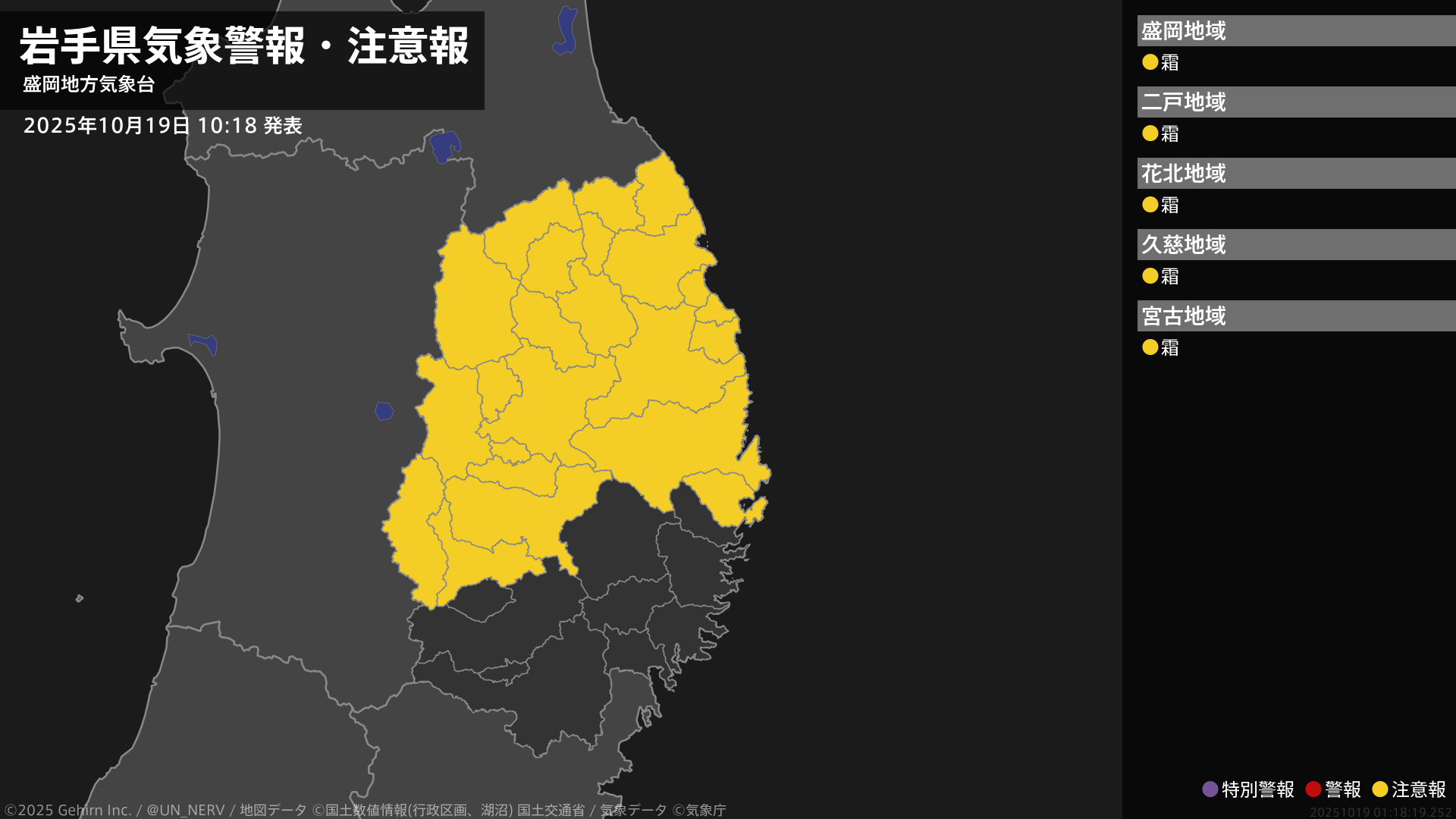【岩手県 気象警報・注意報 2025年10月19日 10:18】内陸、沿岸北部では、20日朝は霜に対する農作物の管理に注意してください。#気象警報注意報 #岩手県