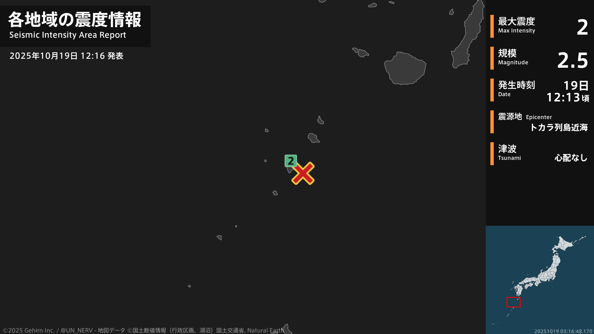 【地震情報 2025年10月19日】12時13分頃、トカラ列島近海を震源とする地震がありました。震源の深さは約10km、地震の規模はM2.5、最大震度2を鹿児島県で観測しています。この地震による津波の心配はありません。#地震 #鹿児島県
