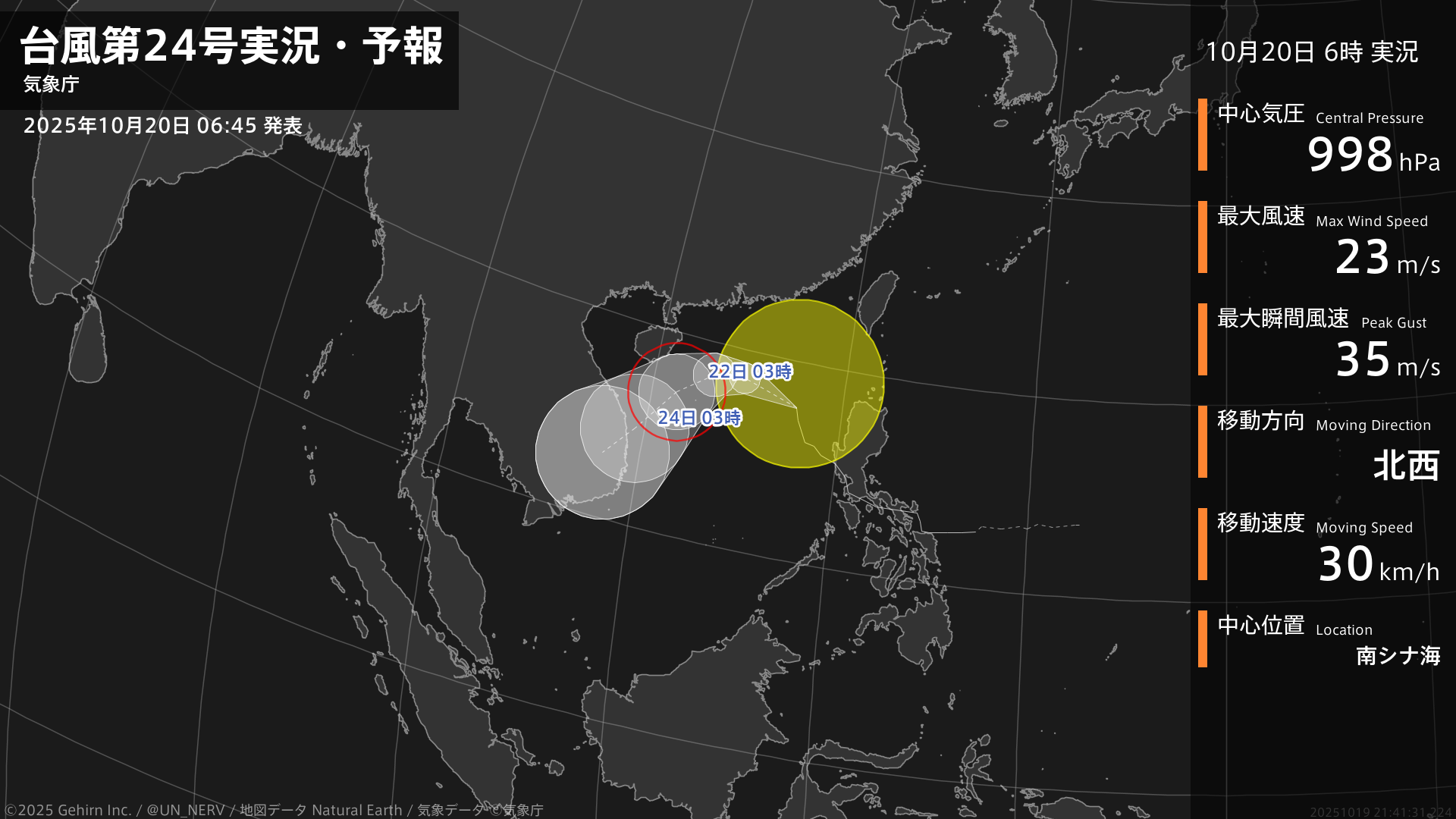 【台風第24号実況・予報 2025年10月20日 06:41】台風第24号(フンシェン)は、南シナ海を1時間に30キロの速さで北西に進んでいます。#台風情報