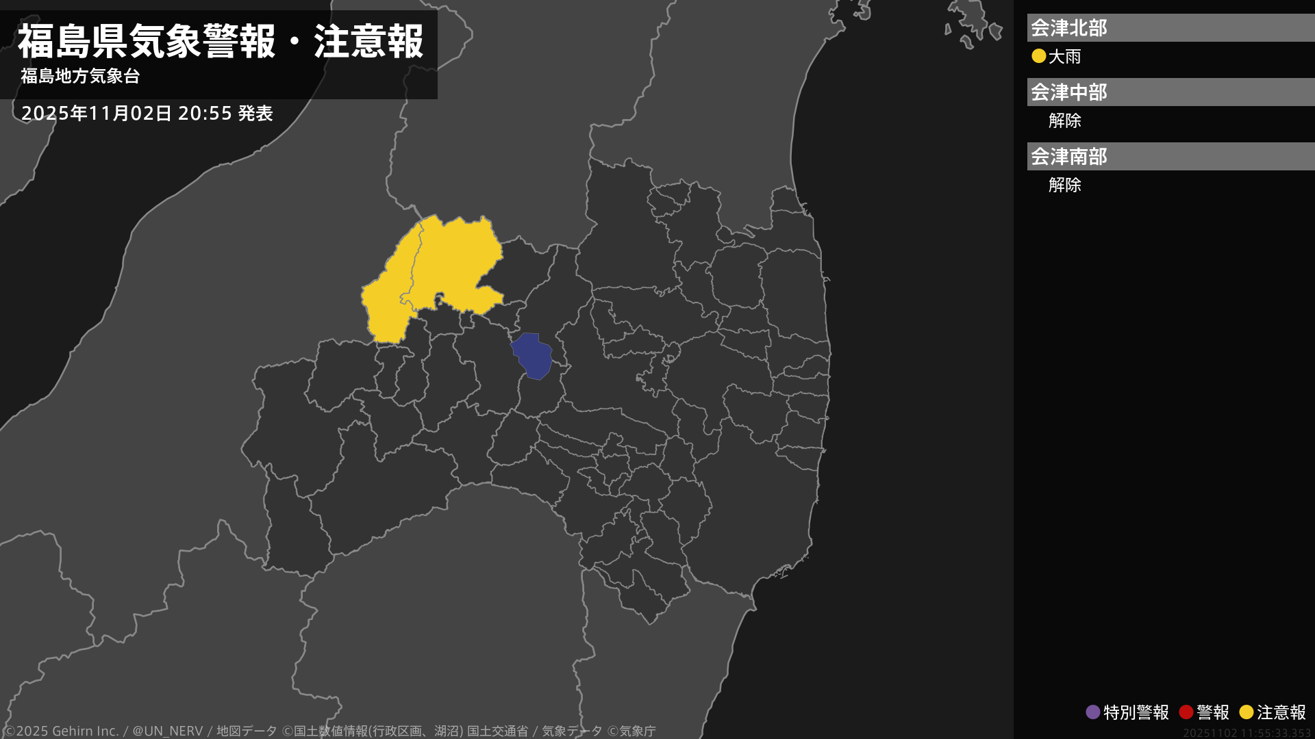 【福島県 気象警報・注意報 2025年11月02日 20:55】