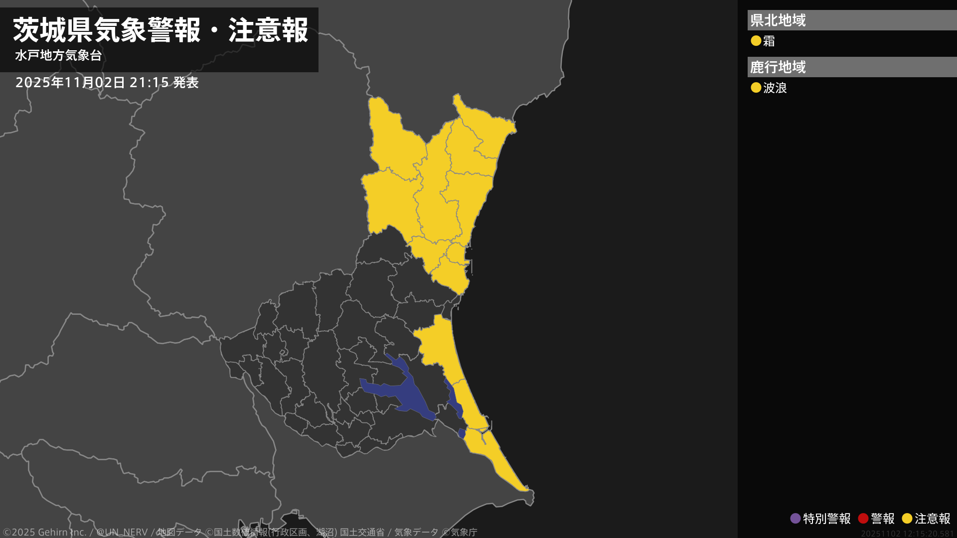 【茨城県 気象警報・注意報 2025年11月02日 21:15】