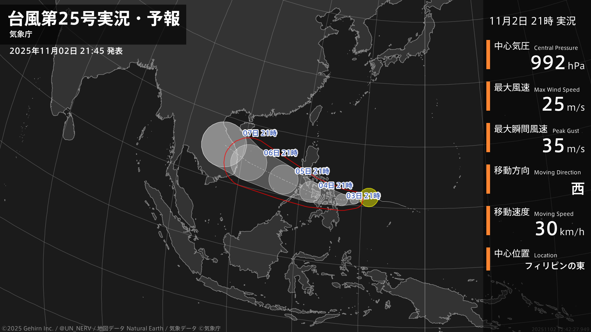 【台風第25号実況・予報 2025年11月02日 21:42】