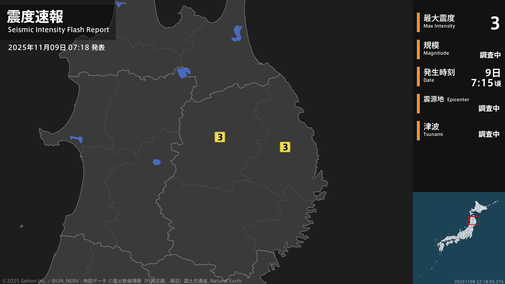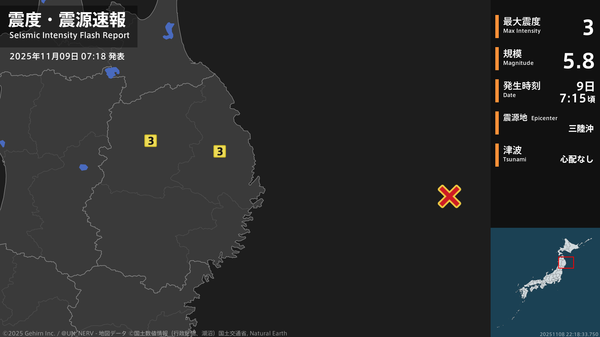 7時15分頃、三陸沖を震源とする地震がありました。地震の規模はM5.6程度、最大震度3程度と推定されています。この情報は気象庁の予報に基づく推定です。情報は誤差を含む場合があります。