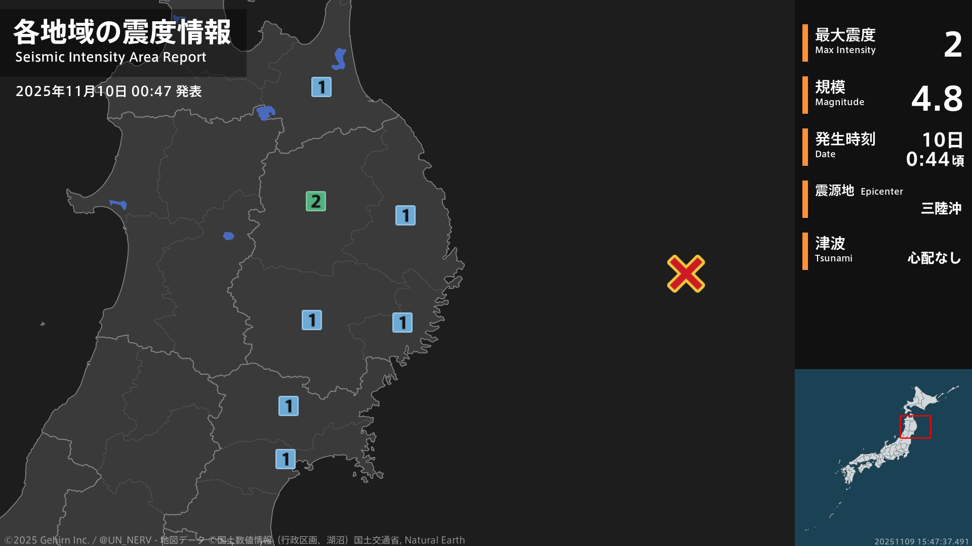 0時44分頃、三陸沖を震源とする地震がありました。地震の規模はM4.7程度、最大震度2程度と推定されています。この情報は気象庁の予報に基づく推定です。情報は誤差を含む場合があります。