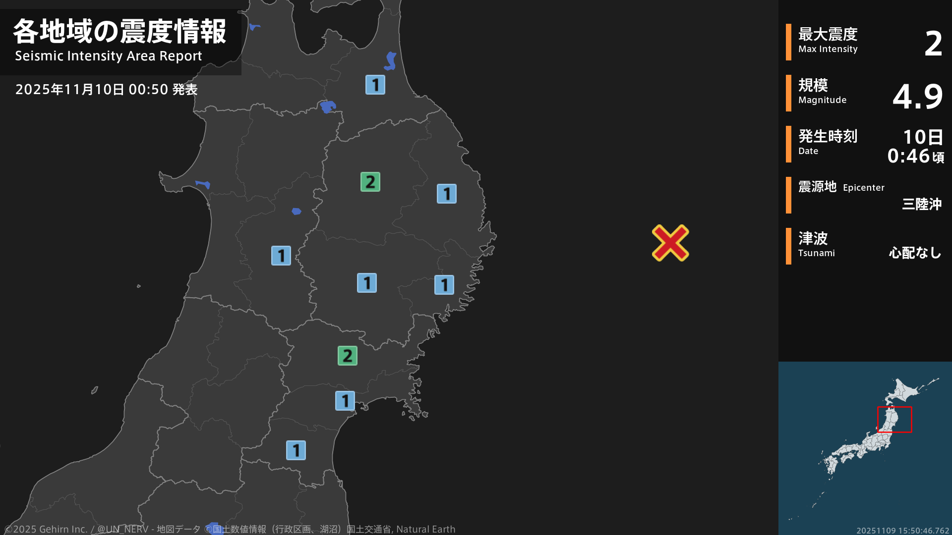 【緊急地震速報 第1報 2025年11月10日】