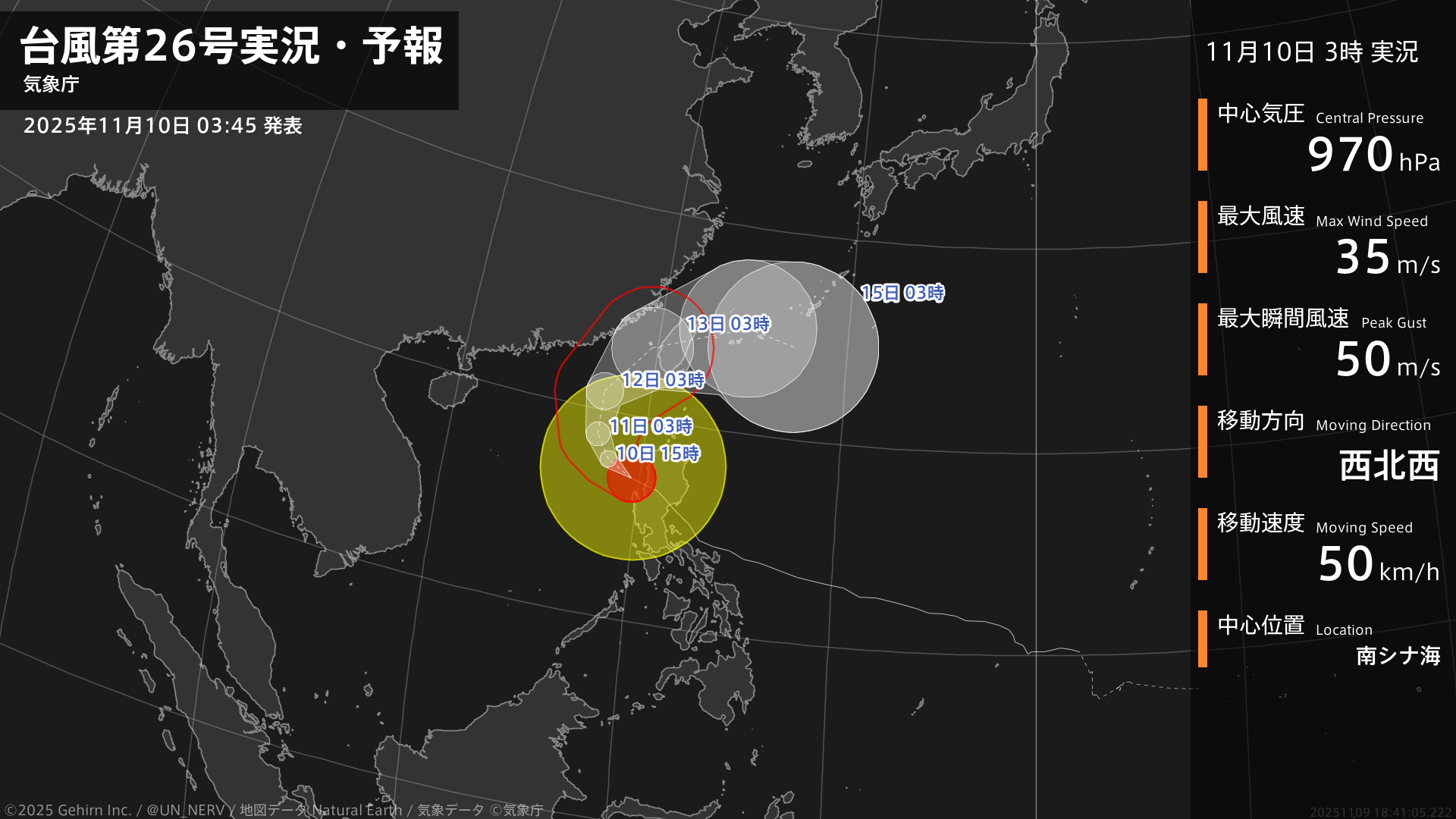 【台風第26号実況・予報 2025年11月10日 03:41】大型で強い台風第26号(フォンウォン)は、南シナ海を1時間に50キロの速さで西北西に進んでいます。#台風情報