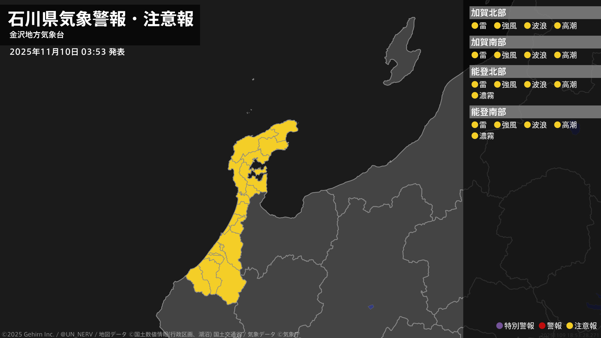 【石川県 気象警報・注意報 2025年11月10日 03:53】石川県では、強風や高波、高潮、急な強い雨、落雷に注意してください。能登では、濃霧による視程障害に注意してください。#気象警報注意報 #石川県