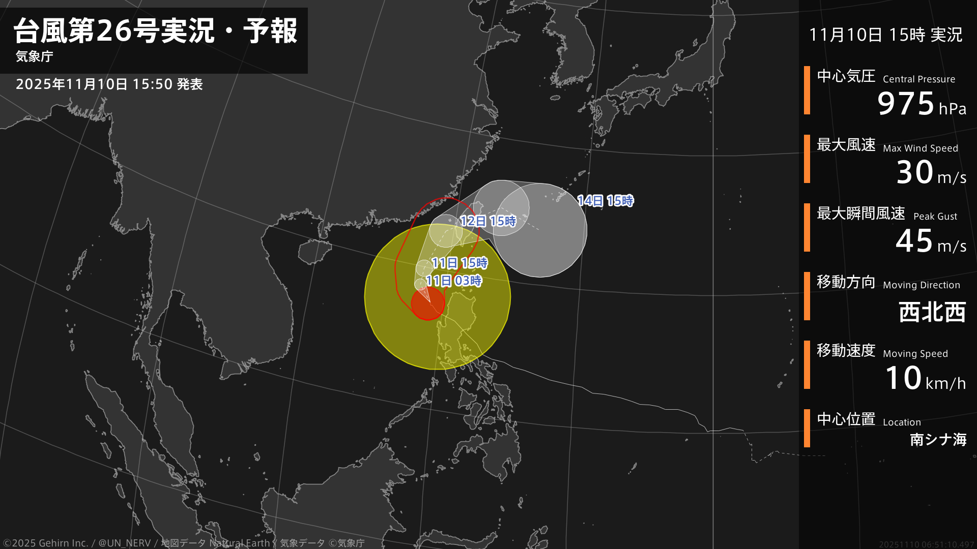 【台風第26号実況・予報 2025年11月10日 15:51】大型の台風第26号(フォンウォン)は、南シナ海を1時間に10キロの速さで西北西に進んでいます。#台風情報