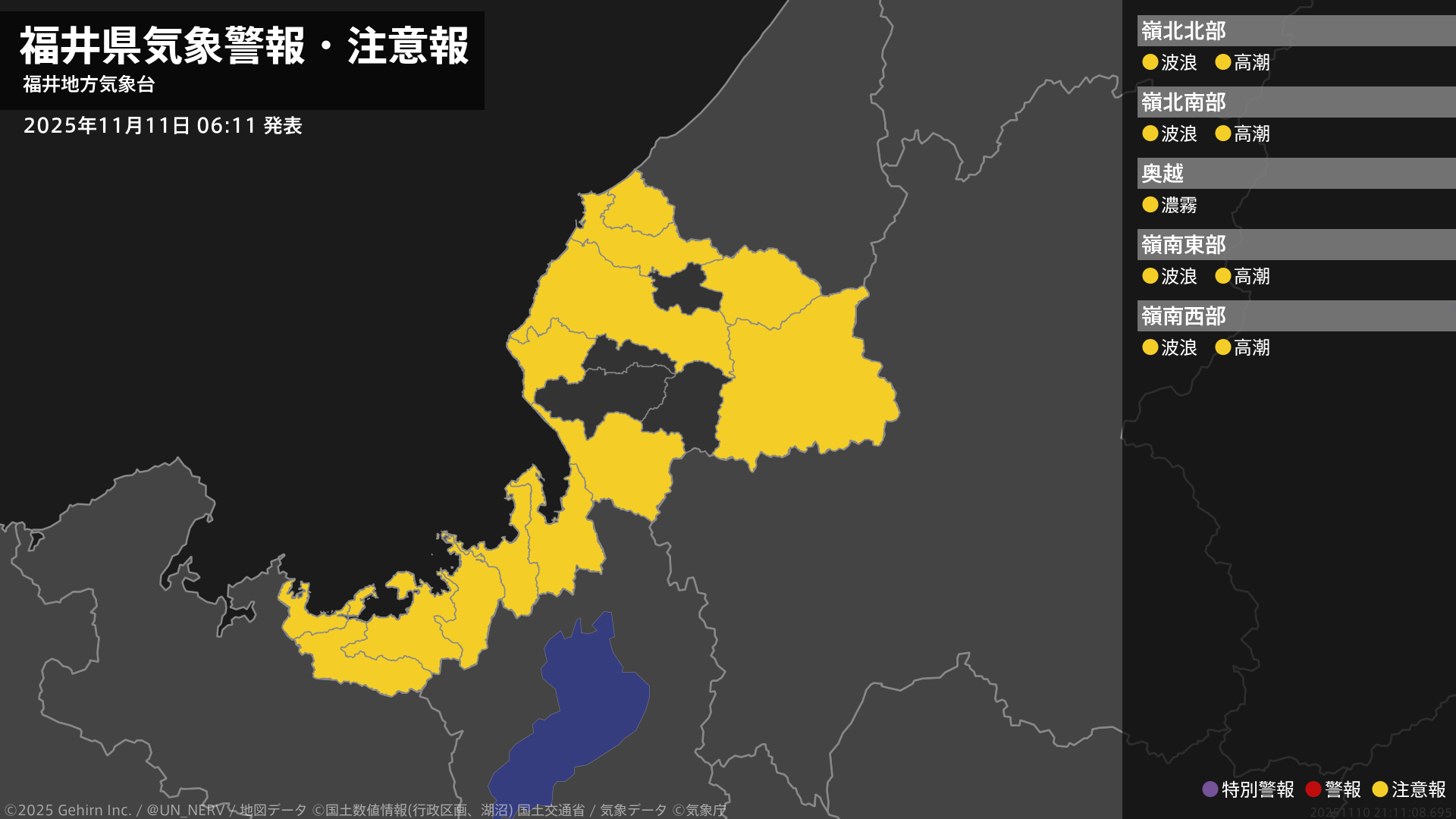 【福井県 気象警報・注意報 2025年11月11日 06:11】福井県では、11日昼前まで高波や高潮に注意してください。嶺北では、11日昼前まで濃霧による視程障害に注意してください。#気象警報注意報 #福井県
