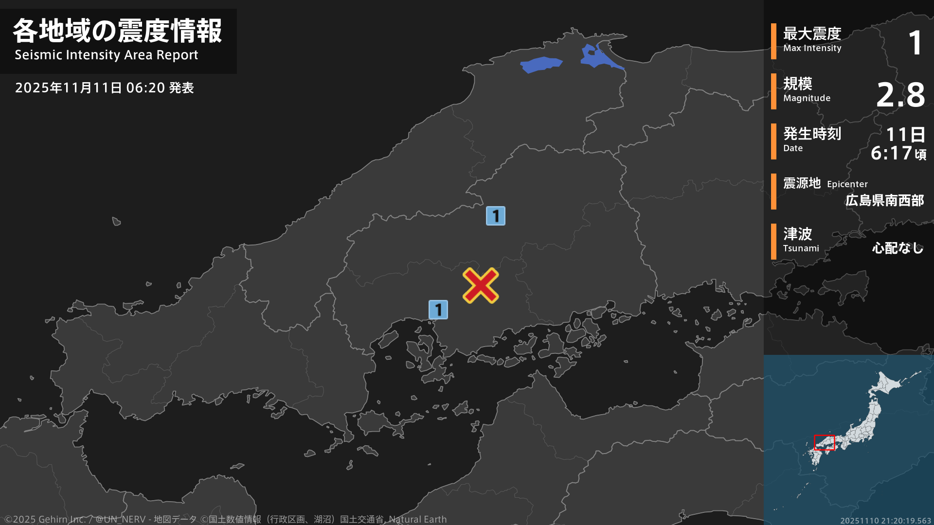 【地震情報 2025年11月11日】6時17分頃、広島県南西部を震源とする地震がありました。震源の深さは約30km、地震の規模はM2.8、最大震度1を広島県で観測しています。この地震による津波の心配はありません。#地震 #広島県