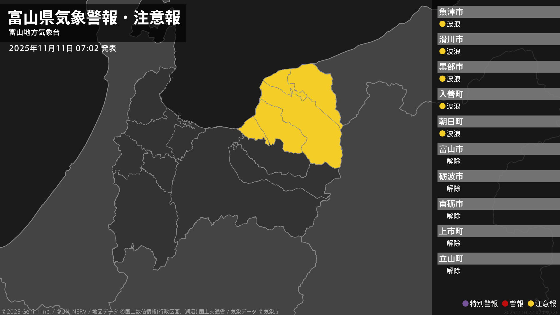 【富山県 気象警報・注意報 2025年11月11日 07:02】東部では、12日未明まで高波に注意してください。#気象警報注意報 #富山県